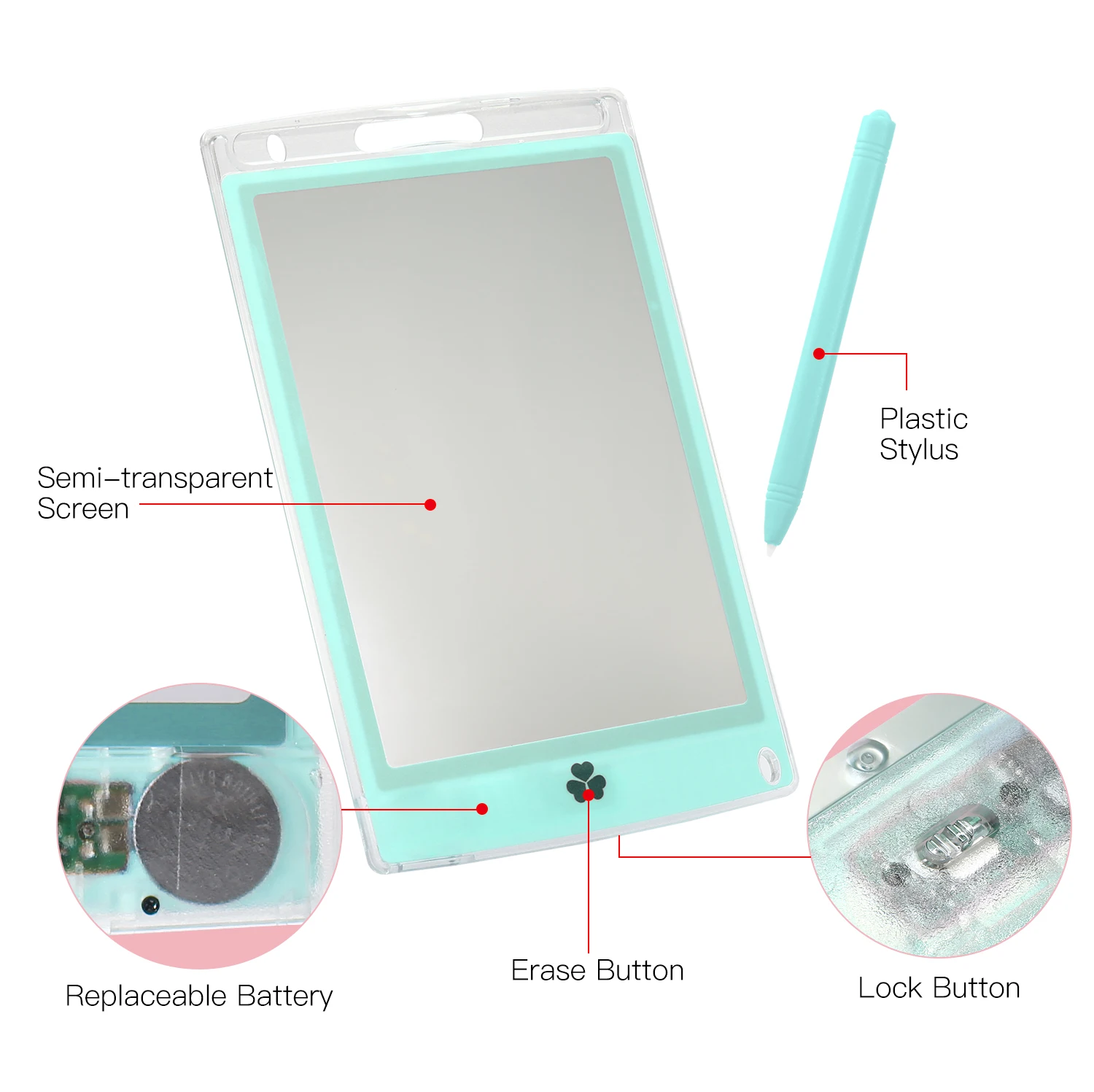 【Стирайте и блокируйте пуговицы 】:С помощью кнопки стирания на планшете для письма нажмите кнопку, чтобы удалить содержимое письма, повторное написание, очень проста в использовании. Назад с дизайном кнопки блокировки экрана, не беспокойтесь об удалении содержимого по ошибке.