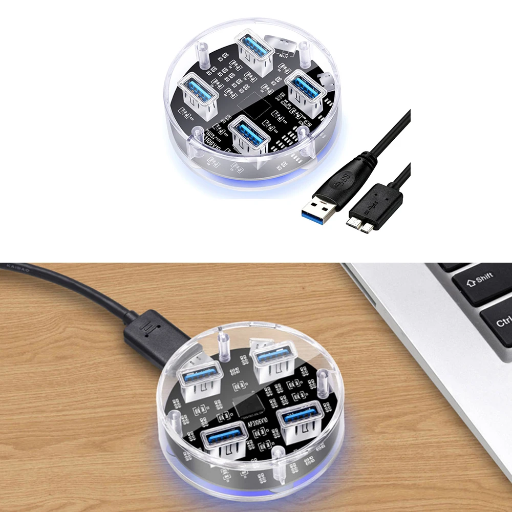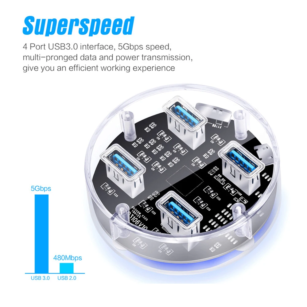 Usb-концентратор имеет четыре слота USB 3,0 для скорости перевода до 5 Гбит/с, которые могут поддерживать одновременную зарядку четырех цифровых устройств.