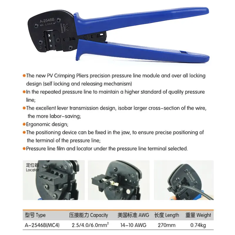 Название продукта: обжимные инструменты Номер товара: A-2546B(MC4) Емкость: 2,5/4,0/6,0 мм ² AWG:14-10 AWG Длина: 270 мм Вес: 0,8 кг