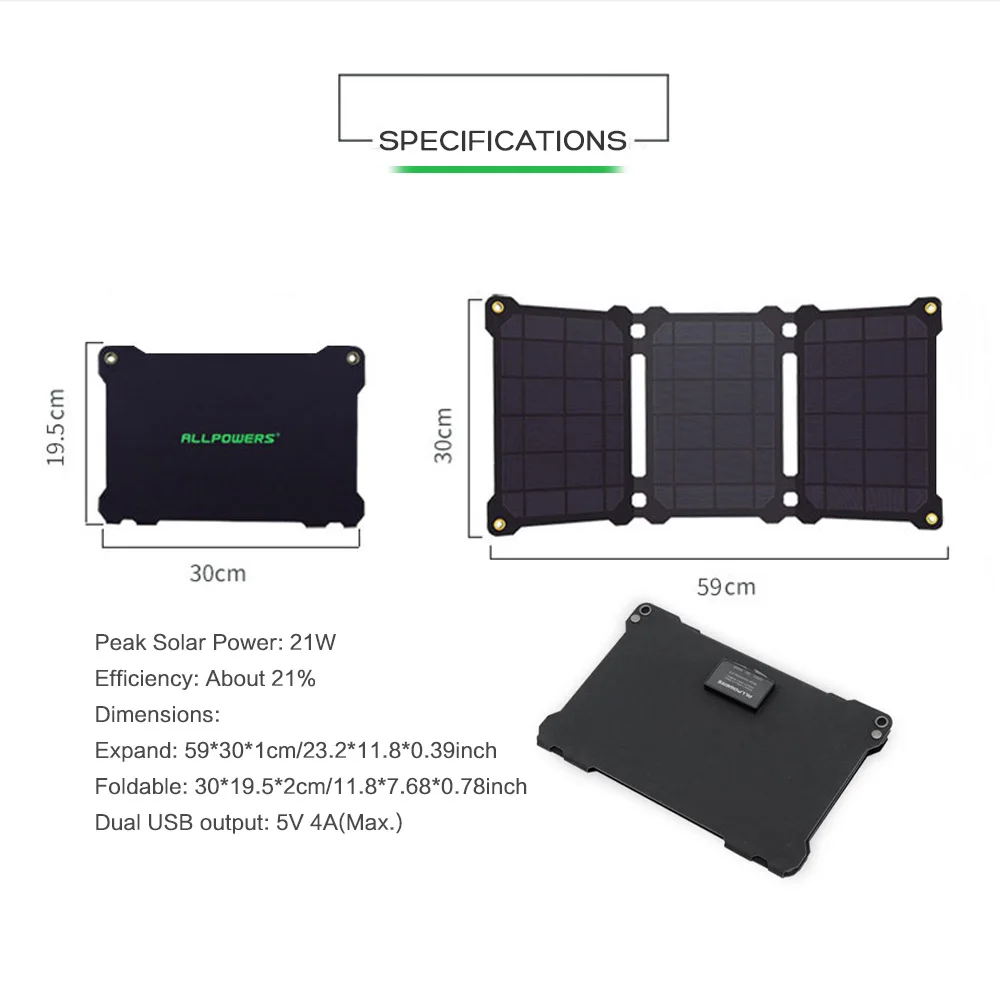 * Пиковая солнечная мощность: 21 Вт * Солнечный Тип: монокристаллическая ламинированная пленка ETFE * Выход: 5V2.4A (макс.), 5V2.4A (макс.) * Водонепроницаемость: IP67 (кроме контроллера) * Размер расширения: 642*300*13 мм/25,2*11,8*0,5 дюймов * Компактный размер: 253 мм * 300 мм * 13 мм/9,9*11,8*0,5 дюймов * Вес нетто: 0,6 кг/1.3lb * Вес брутто: 0,76 кг/1,67 фунтов