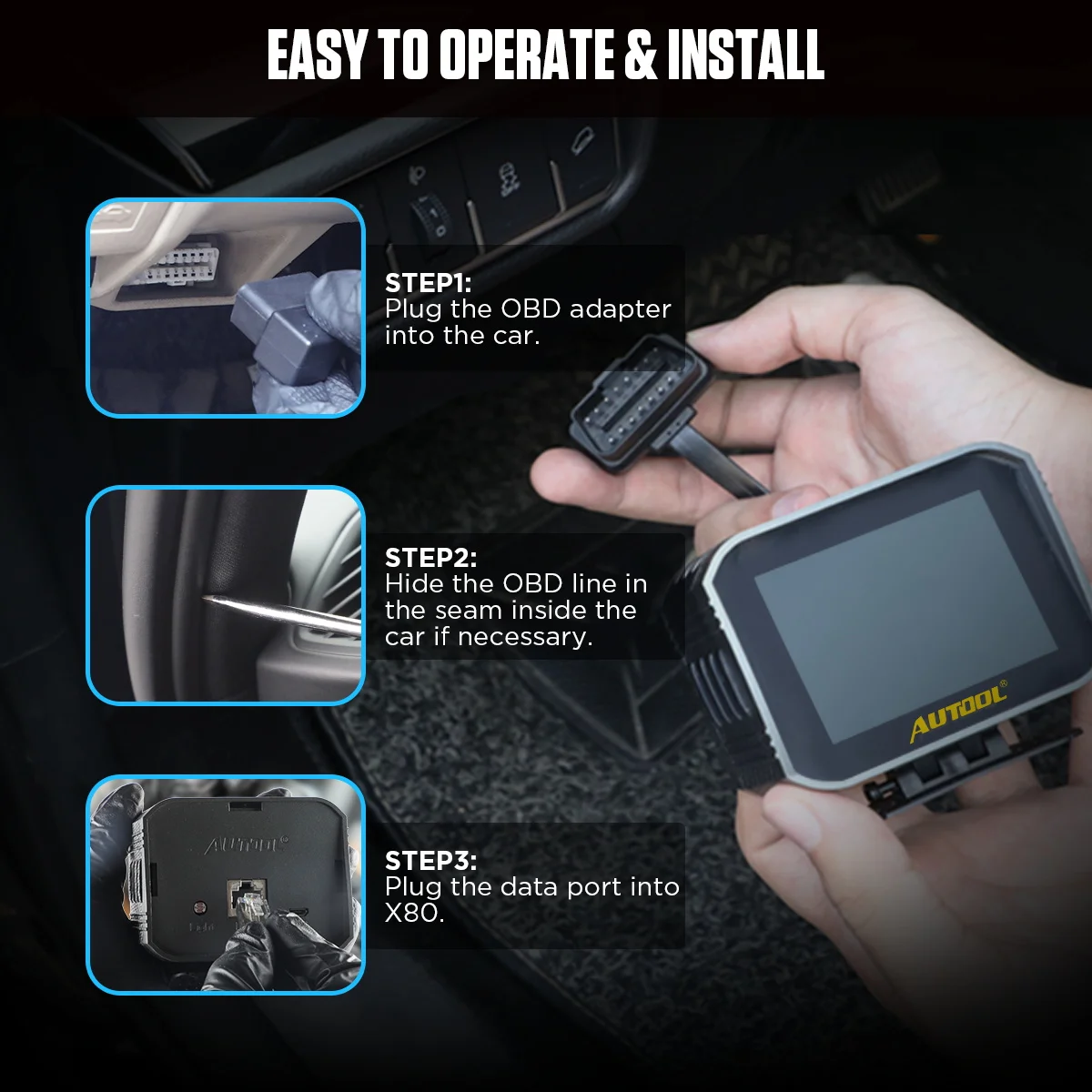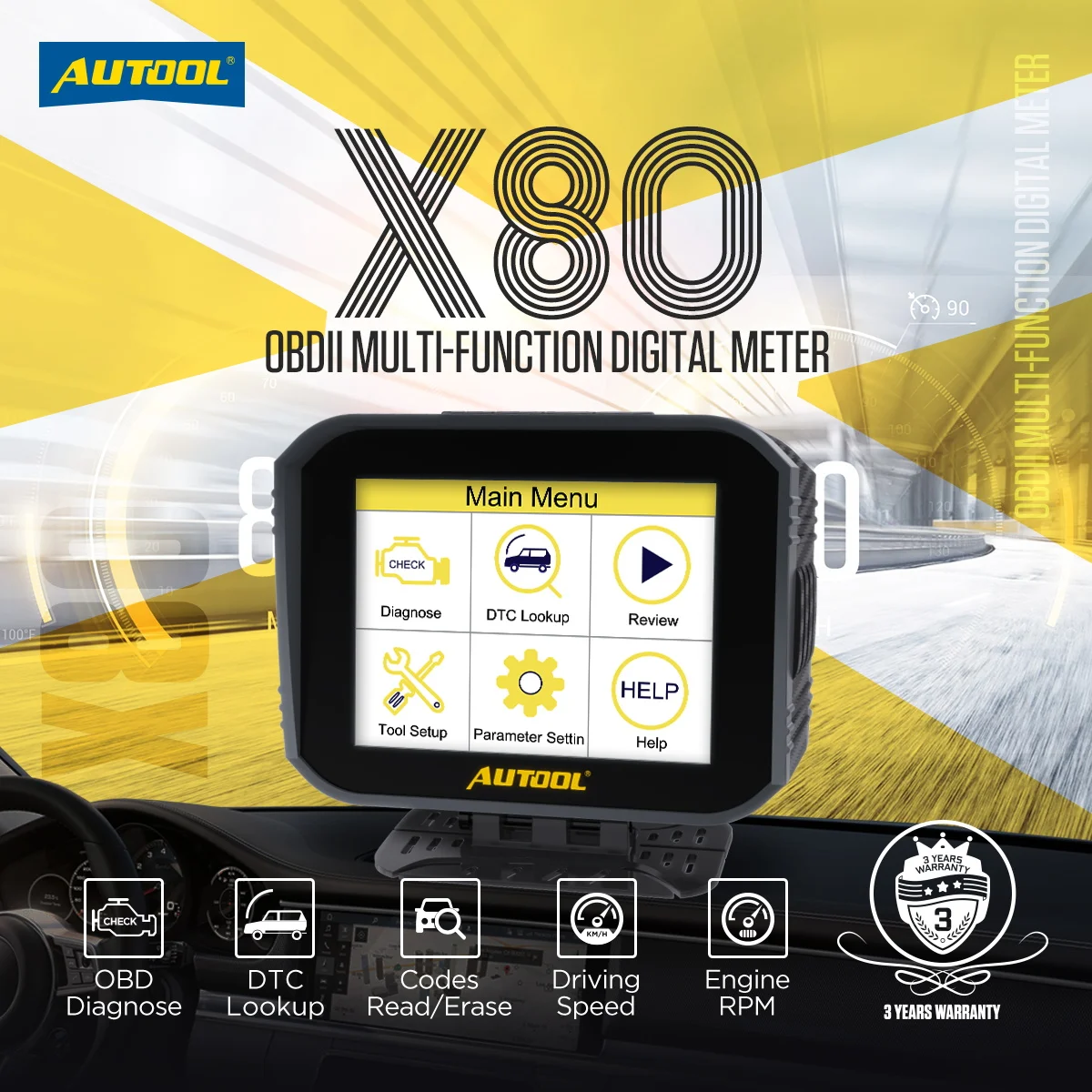 X80 поддерживает отображение параметров, перечисленных ниже: 1. Скорость, средняя скорость 2. Температура воды, температура впуска 3. Внешняя температура, напряжение 4. Температура топлива, давление впуска 5. Нагрузка двигателя, об/мин 6. Мгновенный расход топлива, уровень топлива 7. Средний расход топлива, расстояние 8. Давление моторного масла, положение дроссельной заслонки 9. Температура моторного масла, угол предварительного зажигания