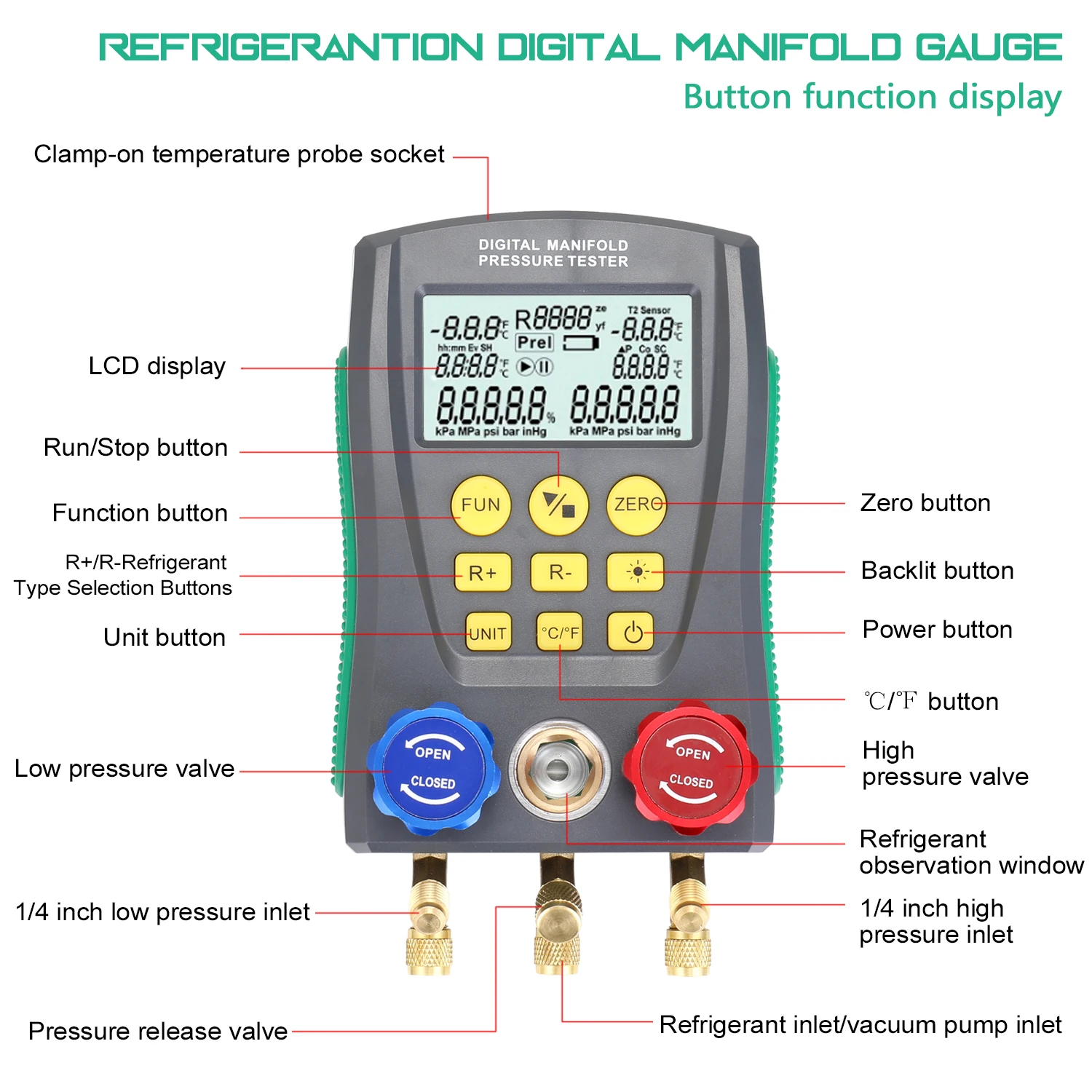 Интеллектуальный электронный хладагент-это вспомогательный инструмент для установки, тестирования и обслуживания холодильного оборудования, например, кондиционеров и холодного хранения. Прибор имеет двойной тест давления, двойной температурный тест (нужно тестовый зажим, не входит в комплект), цифровое считывание, многофункциональное переключение, многофункциональная функция и встроенная база данных холодильника. Инструмент использует Высокопрочный инженерный пластик и гибкий нескользящий дизайн силикона, вся машина является твердой и удобной для удержания. Встроенный 32-битная цифровая обработка блок и высокой точности система сбора и обработки данных блок, которые ставят высокие данные и стабильности во всем мире. Большой размер жидкокристаллического дисплея, ЖК-дисплей задняя светильник поддержки, отображение данных четкий и удобный для чтения, удобный светильник операции. Переключатель клапанов с длительным сроком службы, стандартный интерфейс 1/4 дюйма, обеспечивающий прочность и универсальность инструмента.
