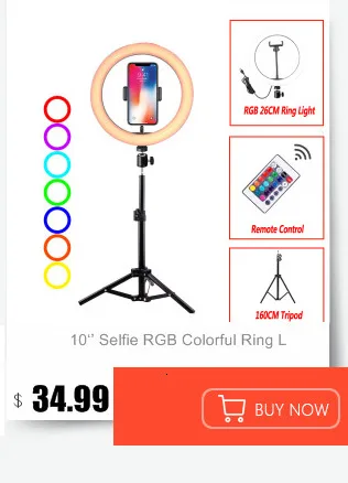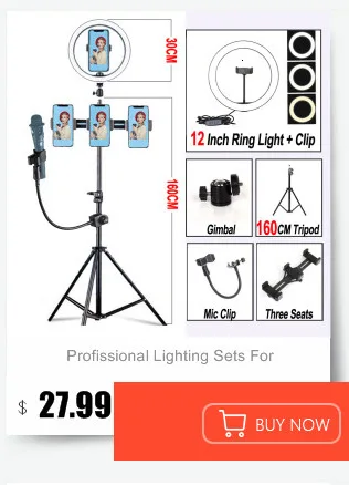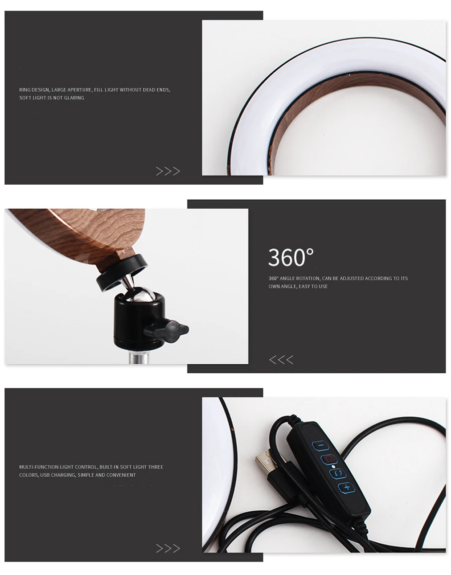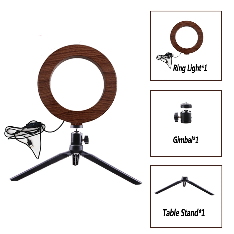 Зарядка: USB Тип: 6-дюймовый светильник с кольцом из темного дерева с подставкой/штативом Штатив/высота стойки: настольная подставка, 50 см штатив, 160 см штатив Светильник: белый, теплый, белый Материал: алюминий + ПК Диапазон затемнения: 1%-100% Цветовая температура: 2800K-6500K Источник: высококачественный светодиодный светильник Использование: продукт/рекламная фотография, прямой светильник, косметический светильник, видео-студия для макияжа
