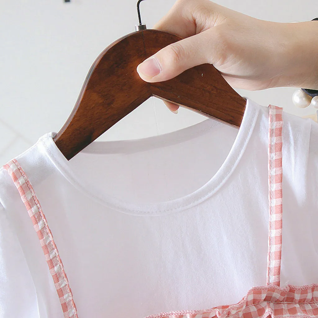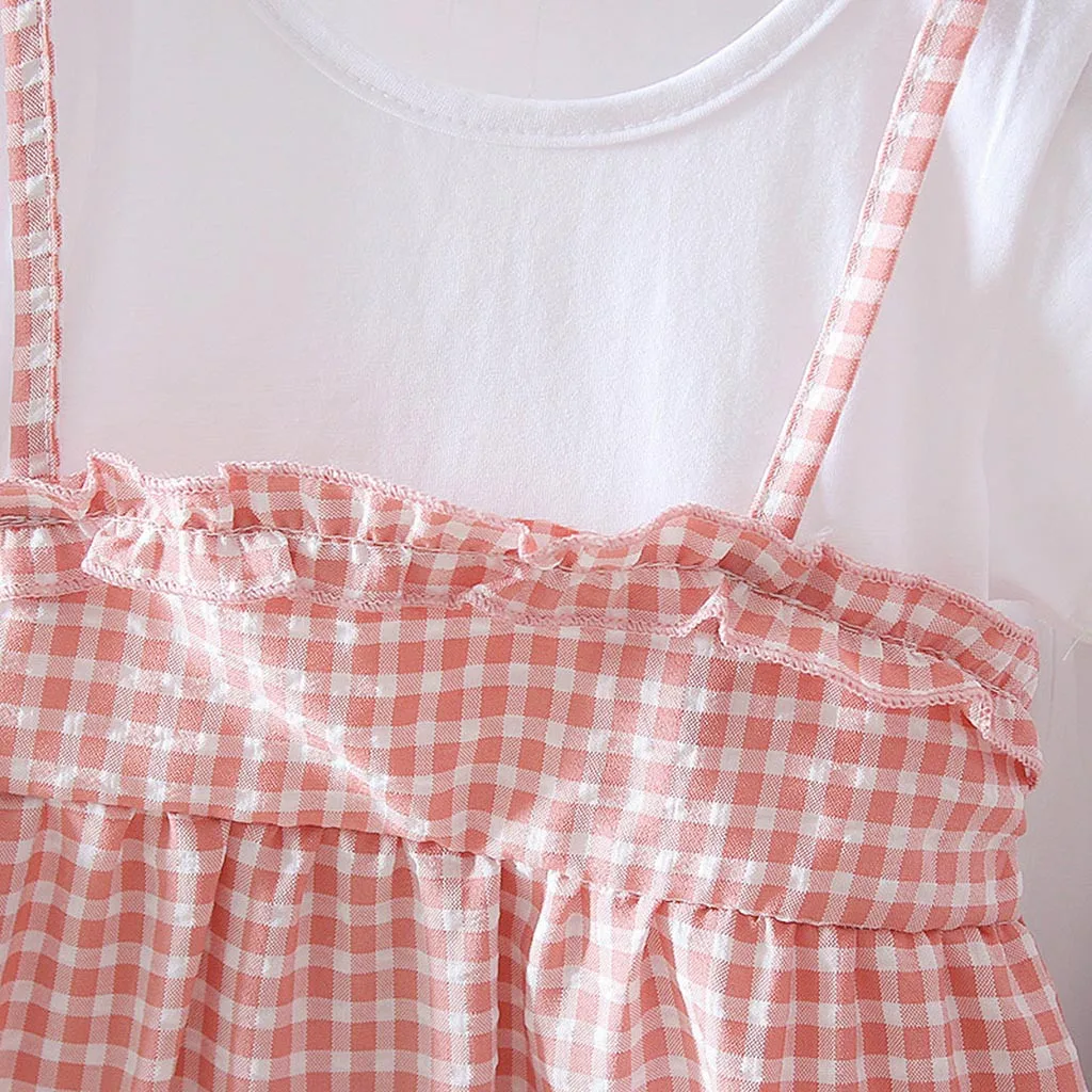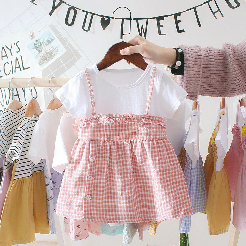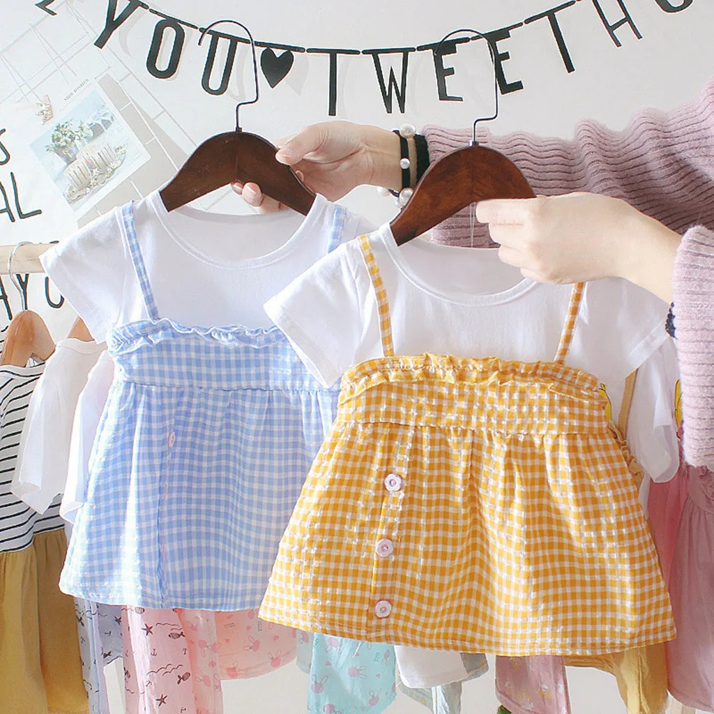 (3 мес.-24 мес.) летнее платье в Корейском стиле для маленьких девочек, клетчатая юбка из двух предметов с короткими рукавами и кружевной оборкой, платье принцессы, 50