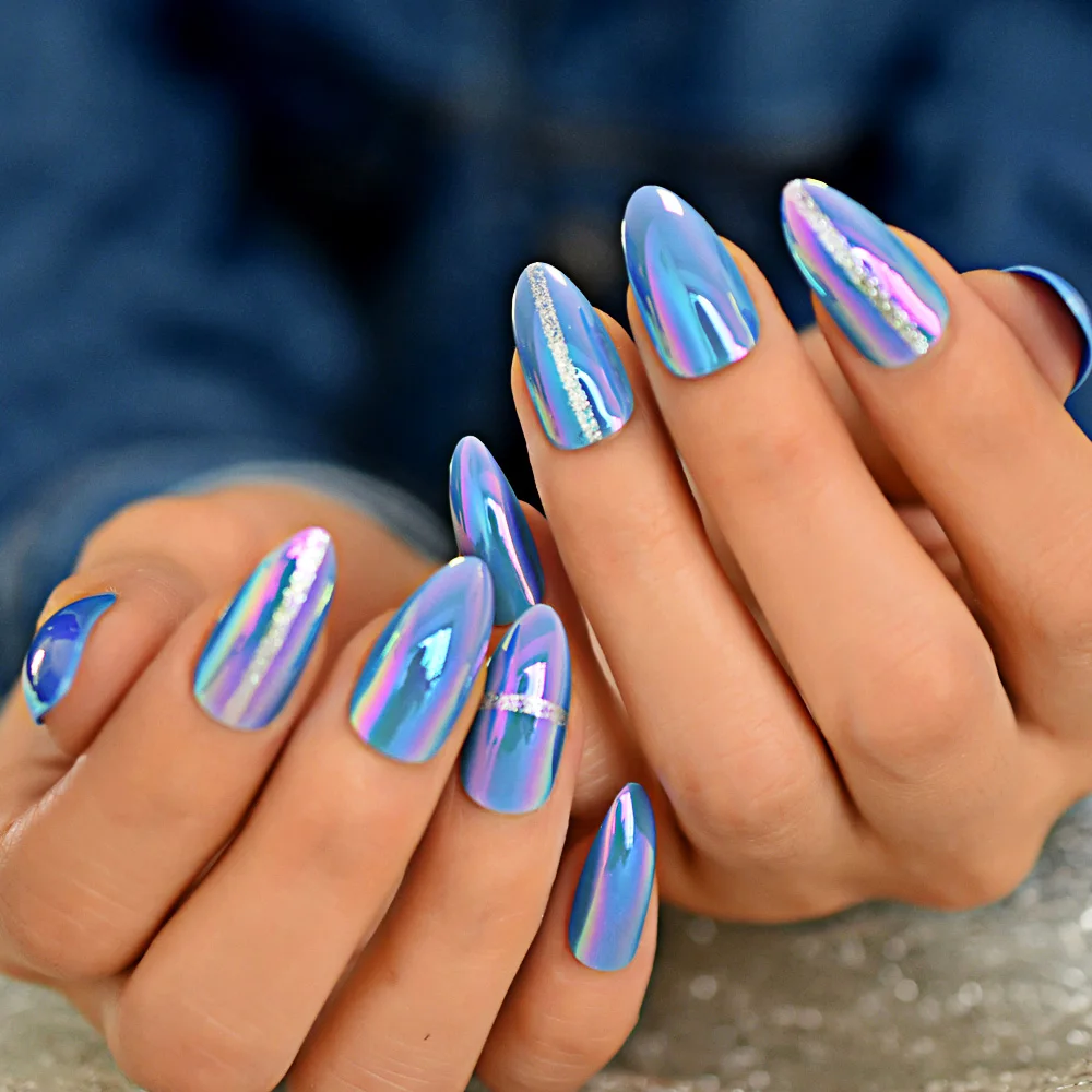 Зеркало-хамелеон, синие шпильки, накладные ногти, серебряная блестящая линия, искусственные накладные ногти, кончики для офиса и дома, искусственный Ongle Посылка: 24 шт гвозди + 1 лист стикер Характеристика: Подходит для использования в офисе, вечерние встречи, показ покупок