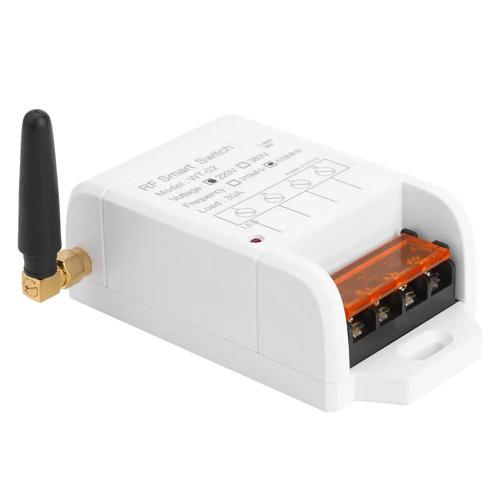 AK-WT02 220 В 433 МГц 30A реле водяной насос светодиодный модуль переключателя беспроводной две кнопки дистанционного управленияОписание: Продукт принимает реле 30A, которое имеет более высокую мощность нагрузки и более стабильную производительность. Приемник принимает модуль приема сверхвысокой чувствительности, и способность анти-помех намного выше, чем у модуля супер-регенерации и обычного супер-гетеродинного модуля на рынке, с внешней антенной, расстояние приема сигнала. Он значительно усилен, выходной ток широкого олова задней части более стабильный, а слот изоляции работает более безопасно и надежнее. Технические характеристики: Модель продукта: WT-02 Корпус: 110*55*35 мм/4,33*2,17 * 1.38in Частота продукта: 433 МГц Рабочее напряжение: 220 В переменного тока Режим работы: Блокировка (по умолчанию) Дистанция дистанционного управления: 2000 м (в открытой среде) Пульт дистанционного управления: 2 батареи 9 В (не входят в комплект) Области применения: насосы, двигатели, мощные лампы и т. Д. Инструкции по уходу за изделием Функция обучения: Режим блокировки: Длительное нажатие кнопки обучения 4-6 секунд светодиодный индикатор загорается, чтобы войти в обучающее состояние, узнать любую клавишу на кнопке дистанционного управления по умолчанию, остальное является ключом. Четкий код операции: Нажмите и удерживайте панель управления, чтобы узнать кнопку около 8 секунд. Индикатор светильник идет находясь в режиме ВЫКЛ (off) в положение ВКЛ. Нажмите и удерживайте кнопку обучения, чтобы указать, что чистый код успешен. Контроллер использование меры предосторожности: 1. Не устанавливайте приемник внутри железной коробки, вдали от двигателей, свяжитесь с другими электрическими устройствами, которые могут вызвать магнитные поля, чтобы избежать помех с сигналами дистанционного управления. 2. Когда вы чувствуете, что расстояние дистанционного управления значительно сокращено, пожалуйста, замените батарею дистанционного управления во время. 3. При установке проводки, пожалуйста, отключите источник питания для обеспечения собственной безопасности; Когда реле работает, светильник индикатора сопровождается индикацией; обратите внимание на значение диапазона обучения сопротивления колебаний дистанционного управления. 4. Старайтесь не использовать кнопки на пульте дистанционного управления как можно чаще, потому что чип беспроводного приемника получает ответ от пульта дистанционного управления около одной секунды. 5. Максимальная емкость пульта дистанционного управления составляет 35 шт.; Фиксированный код EV1527, PT2262 и обучающий код совместимы. Примечания: Возможны отклонения в 1-3 мм вследствие измерений вручную. В связи с различиями мониторов и эффектами освещения реальный цвет товара может немного отличаться от цвета на фотографиях. Спасибо за понимание.