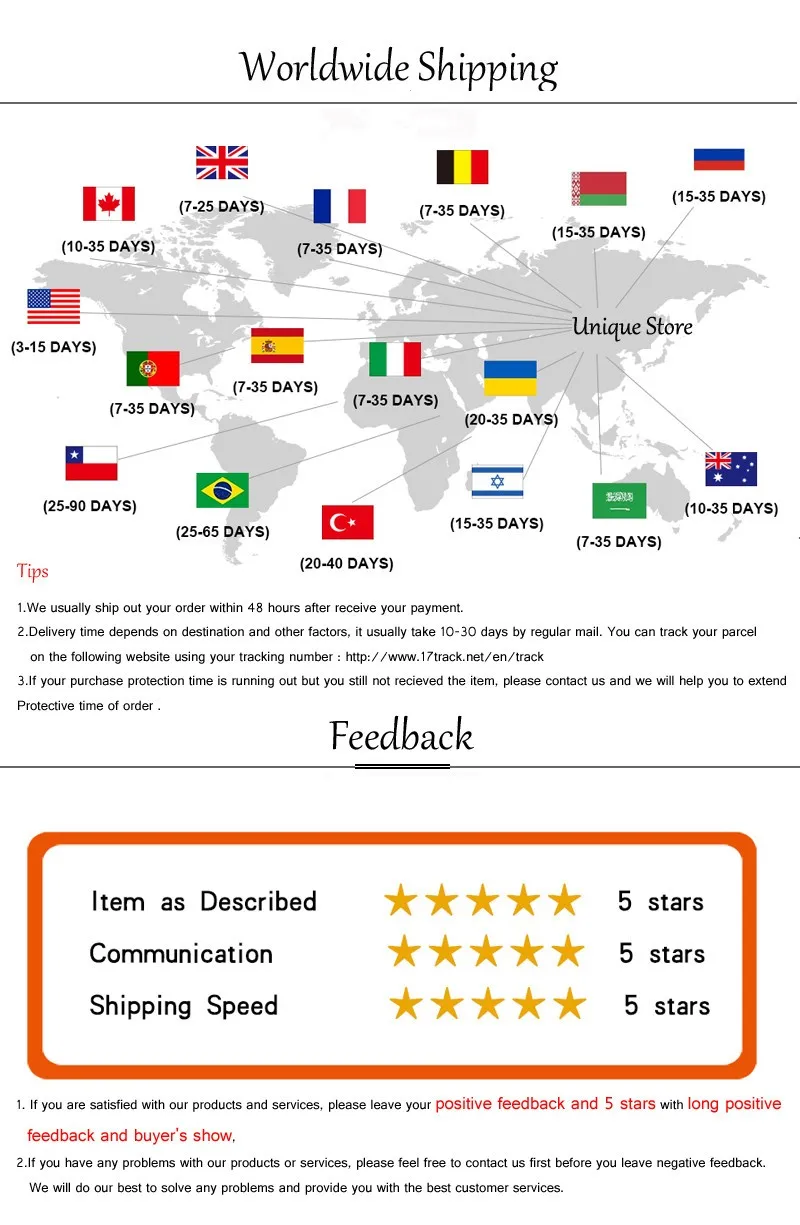 1. Если вы удовлетворены своей покупкой и нашим обслуживанием, пожалуйста, оставьте нам отзывы с пятью звездами и положительные комментарии к вашему опыту, мы будем очень признательны.