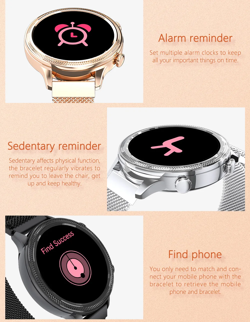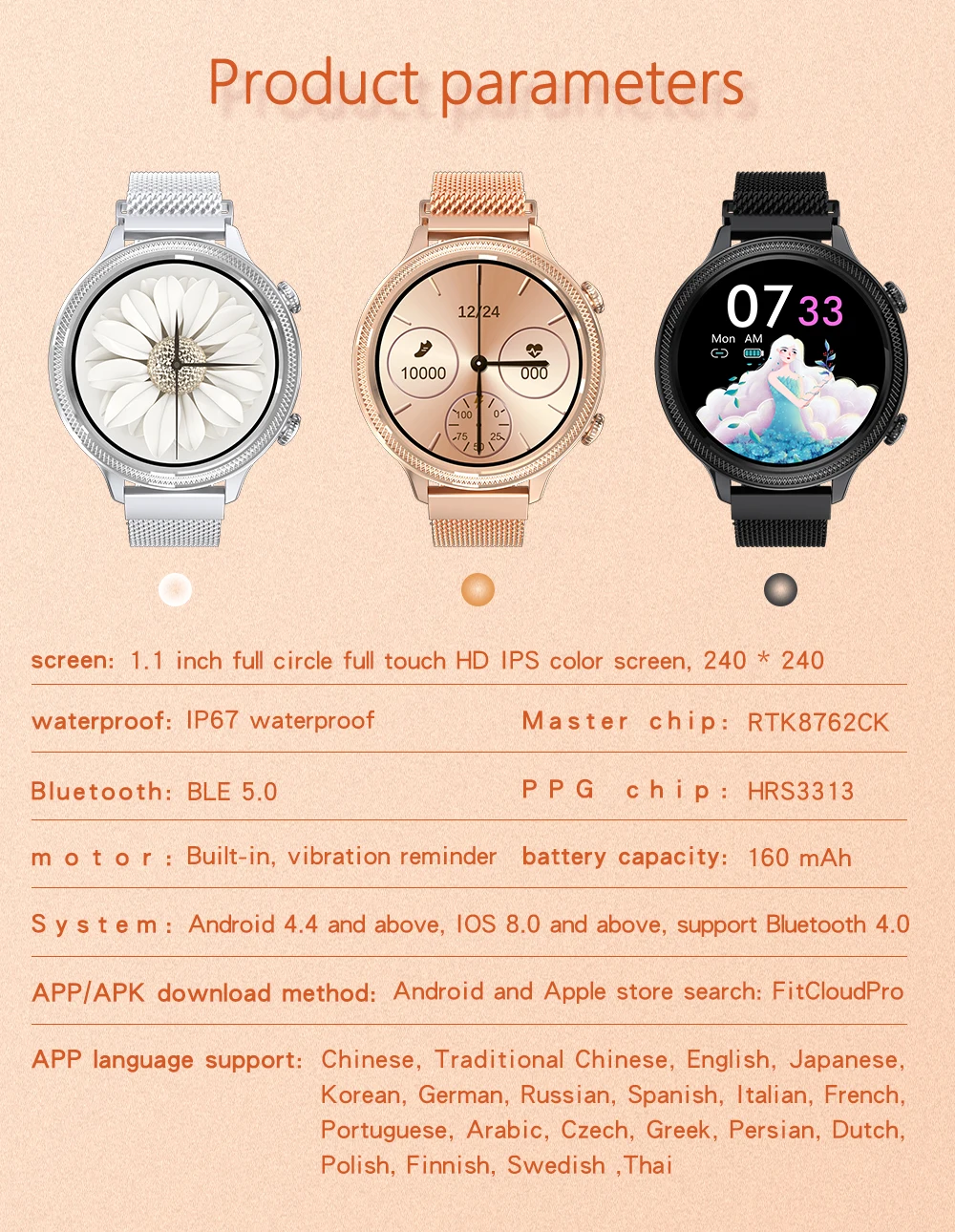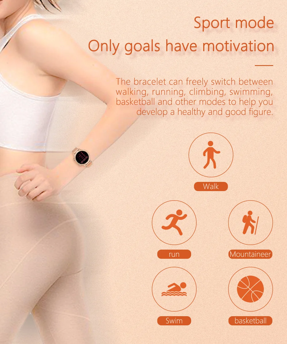 * Полный сенсорный/круглый Смарт-часы с 1,1 дюймовый IPS экран, разрешение 240*240 * 24 часа непрерывного обнаружения сердечного ритма, контроля артериального давления, оксиметрии, теста сна * Отображение времени/часов, шаг, калории, расстояние, сон, камера * Женский физиологический период * Металлический корпус + Миланский ремешок * Мониторинг сна (время сна, качество сна) * Напоминания о звонках, sms-напоминания, qq напоминания, Wechat и другие напоминания приложения. * Спортивный режим: ходьба, бег, туризм, плавание, баскетбол * Будильник, напоминание о сидячем положении, найти браслет * Пульт дистанционного управления камерой (встряхните, чтобы сделать фотографии) * Синхронизация приложений Android и Apple: FitCloudPro * Версия системы Android 4,4 или выше; Версия системы iOS 8,0 или выше; Поддержка Bluetooth-Совместимость с версией 4,0; * IP67 из водонепроницаемого материала