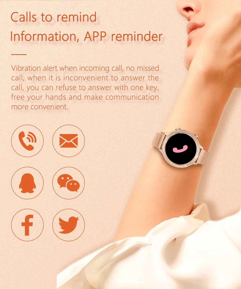 * Тонкий и легкий корпус, более элегантный и удобный между запястьями. * Модный и изысканный круглый циферблат, запечатлеет Вашу привлекательность моды. * Больше функций для мониторинга деятельности в течение всего дня: Удаленная фотография/WeChat Спорт/напоминание о жизни измерение в одно касание. * Мониторинг здоровья: измерение пульса, измерение артериального давления и мониторинг сна. * Никогда не пропускает массаж и телефонные звонки, он может сохранять записи массажа, такие как WeChat, QQ, Whatsapp и т. Д. * Со встроенным аккумулятором 140 мАч, Время в режиме ожидания до 15 дней. * Отлично подходит для спорта, пожилых людей, мальчиков, девочек, подходит для большинства людей, которым нужно следить за здоровьем.