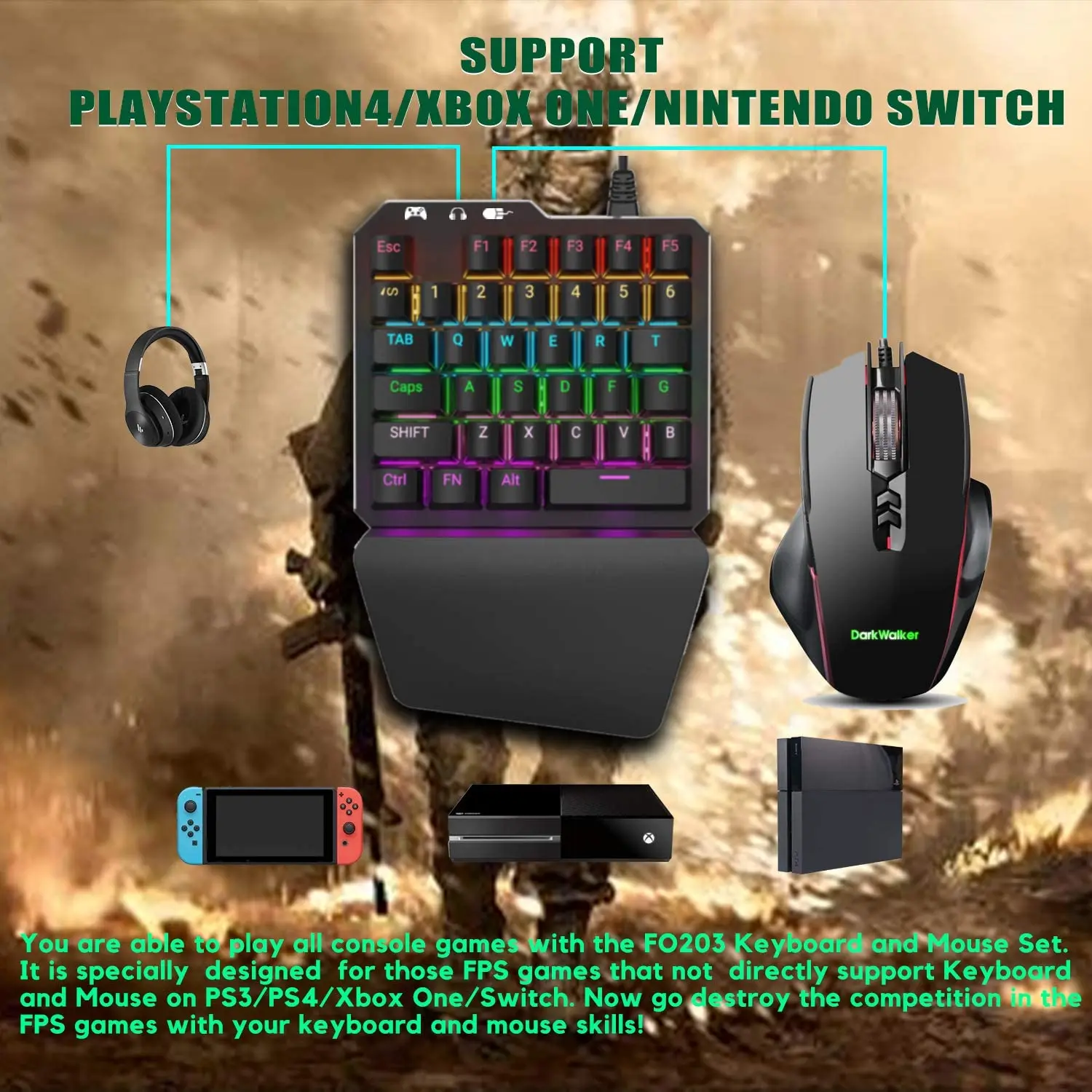 Поддерживаемые платформы: Комбинация клавиатуры и мыши FO203 поддерживает PlayStation 3, PlayStation 4, Xbox One и Nintendo Switch. Вы можете играть во все Консольные игры с набором клавиатуры и мыши FO203. Он разработан специально для тех игр FPS, которые не поддерживают клавиатуру и мышь на PS3/PS4/Xbox One/Switch. Теперь Уничтожьте соревнования в играх FPS с помощью ваших навыков клавиатуры и мыши! Поддержка вечерние чат: FO203 клавиатура и Мышь набор поставляется с 3,5 мм разъем для подключения гарнитуры. Подключите наушники к клавиатуре, чтобы общаться с друзьями. RGB Освещение и регулируемые уровни DPI мыши: Набор клавиатуры и мыши FO203 создан с синим переключателем клавиш и 7 различными эффектами освещения RGB. 4 Регулируемый Мышь Точек на дюйм уровней (800/1200/1600/2400, перепрограммируемый) удовлетворить ваши различные потребности. Предустановленный и настроенный KEYBINDS доступный: FO203 клавиатура и мышь комбо имеет предустановленные keybinds доступны. Вы также можете настроить собственные брелки с помощью программы Delta Keymap. Программа Delta Keymap теперь доступна на ПК Windows. Посылка включает в себя: 1 * Проводная клавиатура, 1 * Проводная мышь, 1 * USB кабель (для использования на PS4/XBOX ONE).