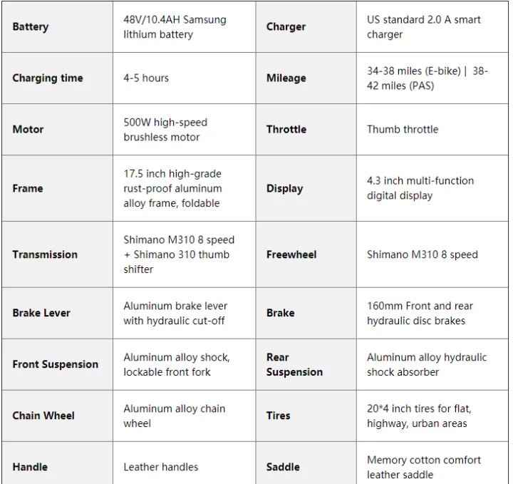 ★[Топ-исполнитель] цельнокроеная складная рама из алюминиевого сплава, механическая блокировка передней подвески, пружинный Задний амортизатор и полные шины 4,0 дюйма. X7 может взять вас в любом месте, независимо от того, мокрый камень, грязные дорожки, песчаный пляж или снежные холмы. Он более удобен с отличной амортизацией, защитой от проколов и более сильной износостойкостью. Возьмите свой складной X7 и исследуйте. ★[Оптимизированная электрическая система] 48V 10.4Ah Samsung скрытый отсек батареи делает X7s более водонепроницаемым. Custom 500W мотор Заднего Привода обеспечивает 60 N · m исключительный крутящий момент, чтобы завоевать все препятствия. До 500 ватт двигателя, который позволяет ему достигать скорости более 28 миль/ч и предлагает помощь в путешествиях до 55 миль за заряд. ★[E · PAS regeneration] E · PAS система превращает двигатель в генератор, который может заряжать от 20% до 60% мощности обратно к батарее, когда вы наслаждаетесь спуском или скорость превышает 14 mph при PAS 0/1. E-PAS эффективно продлевает срок службы двигателя и аккумулятора и позволяет вашему велосипеду иметь больший Пробег (от 60 до 80 миль). Это одна из причин, почему вы влюбитесь в него. ★[Переключения и тормоза] Shimano SL-TX50 7 скоростей и RD-TY300 переключателей обеспечивают точное и плавное переключение гарантирует, что ваш подъездный поезд будет отвечать в течение длительного времени. Оснащенный механическими дисковыми тормозами Tektro спереди и сзади, X7 обладает сильной и отзывчивой тормозной силой, которая обеспечивает полный контроль на другой поверхности. ★[Обслуживание] 80C Интеллектуальный IP65 водонепроницаемый ЖК-дисплей показывает больше вы хотите. Поворотная дроссельная заслонка, 5 Вт яркая фара, мягкое седло и легкая контрольная рукоятка. Каждая часть тщательно отбирается и тщательно проверяется на качество. Мы объединили наши производственные знания с компонентами надежных брендов для обеспечения экономически эффективных электрических велосипедов. 85% предварительно собранный.