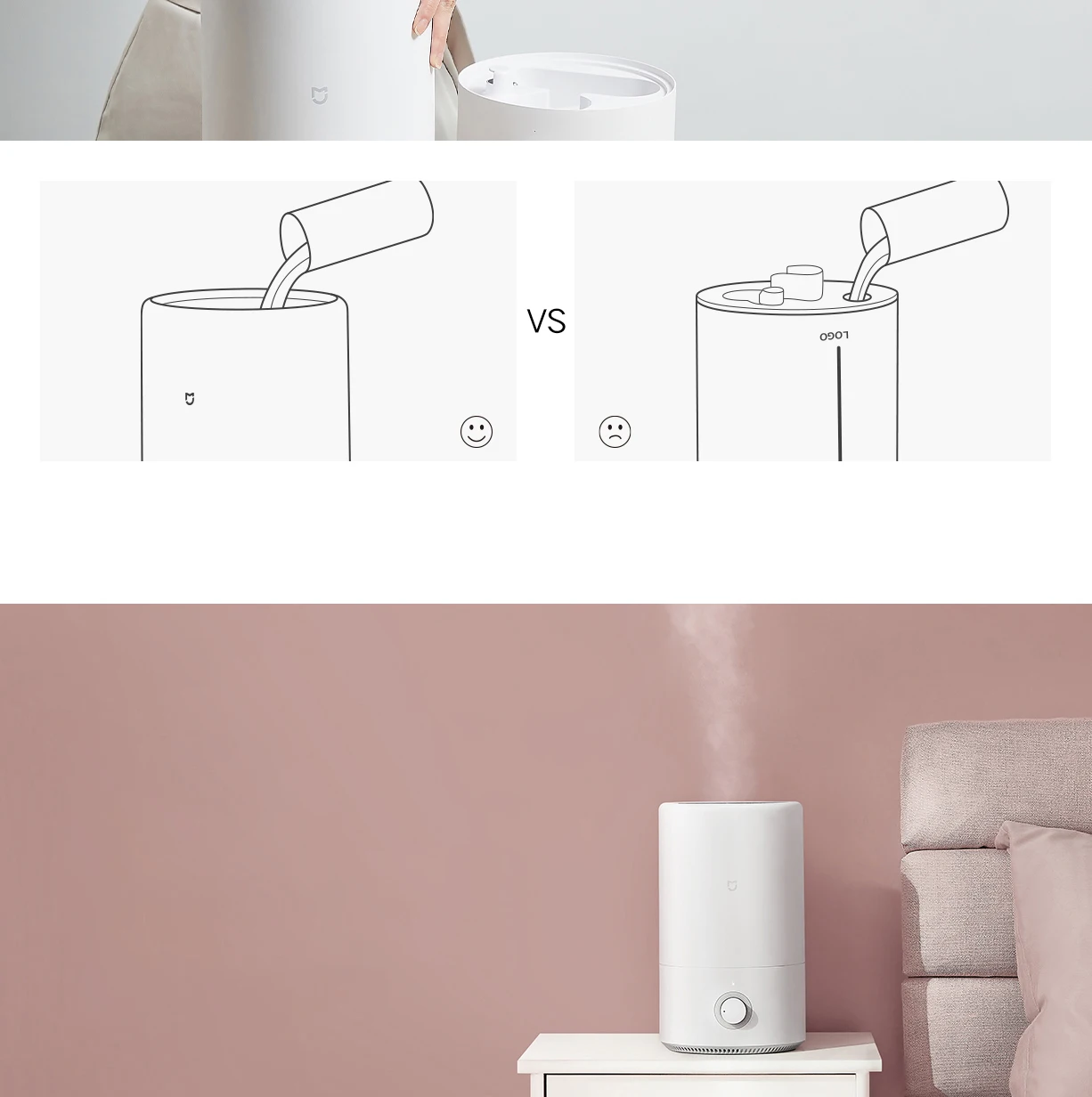 Добавьте воду из верхней части увлажнителя, количество увлажнения 280 мл/ч, антибактериальное серебро, тихая работа.