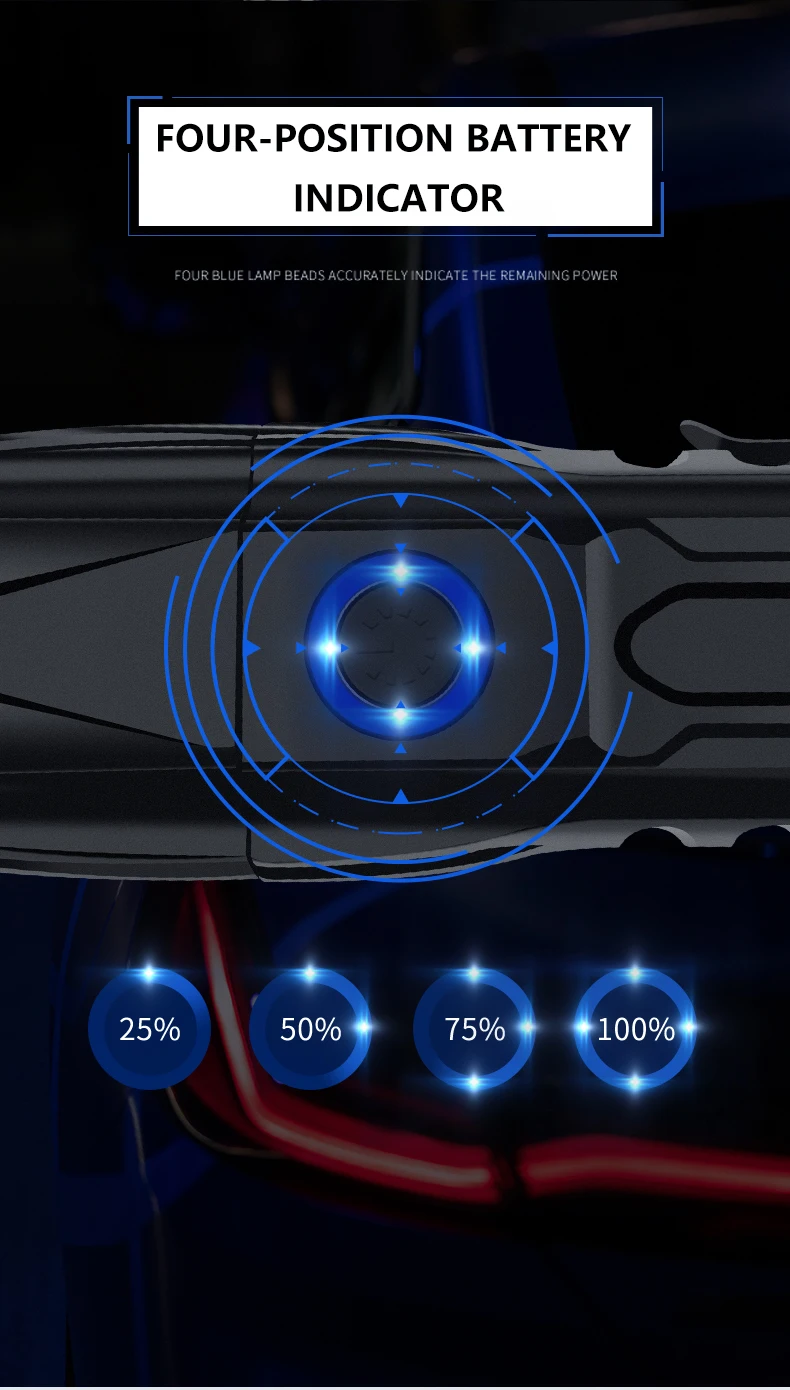 * Защита от низкого напряжения, когда напряжение батареи слишком низкое, оно автоматически отключится. Инструкции по зарядке, четыре фонаря постоянно горят один за другим. Индикация разряда, четыре лампы гаснут один за другим.