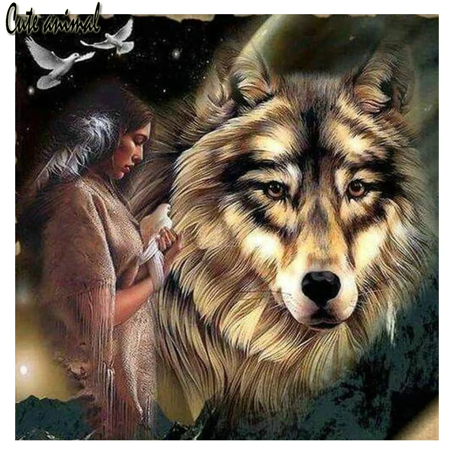 Алмазная картина 5D DIY Алмазная картина полностью квадратная дрель индийская женщина и волк вышивка крестиком американское Примитивное племя