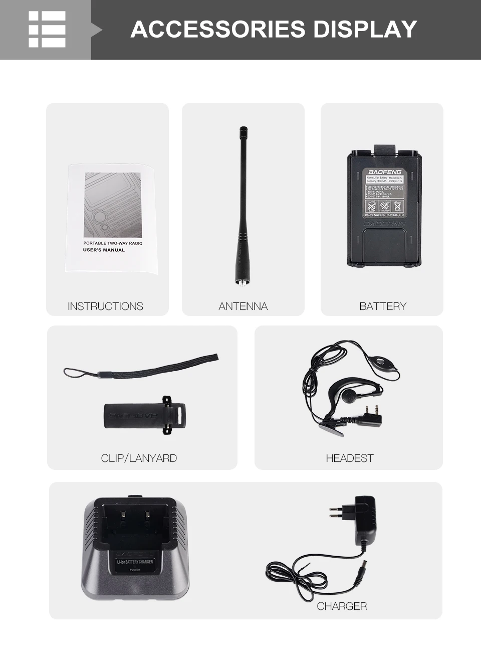 1 х портативное радио 1 X Антенна 1 х литий-ионный аккумулятор 1 X литий-ионное зарядное устройство 1 X Зажим для ремня 1 X слинг 1 х наушник 1 X Руководство пользователя