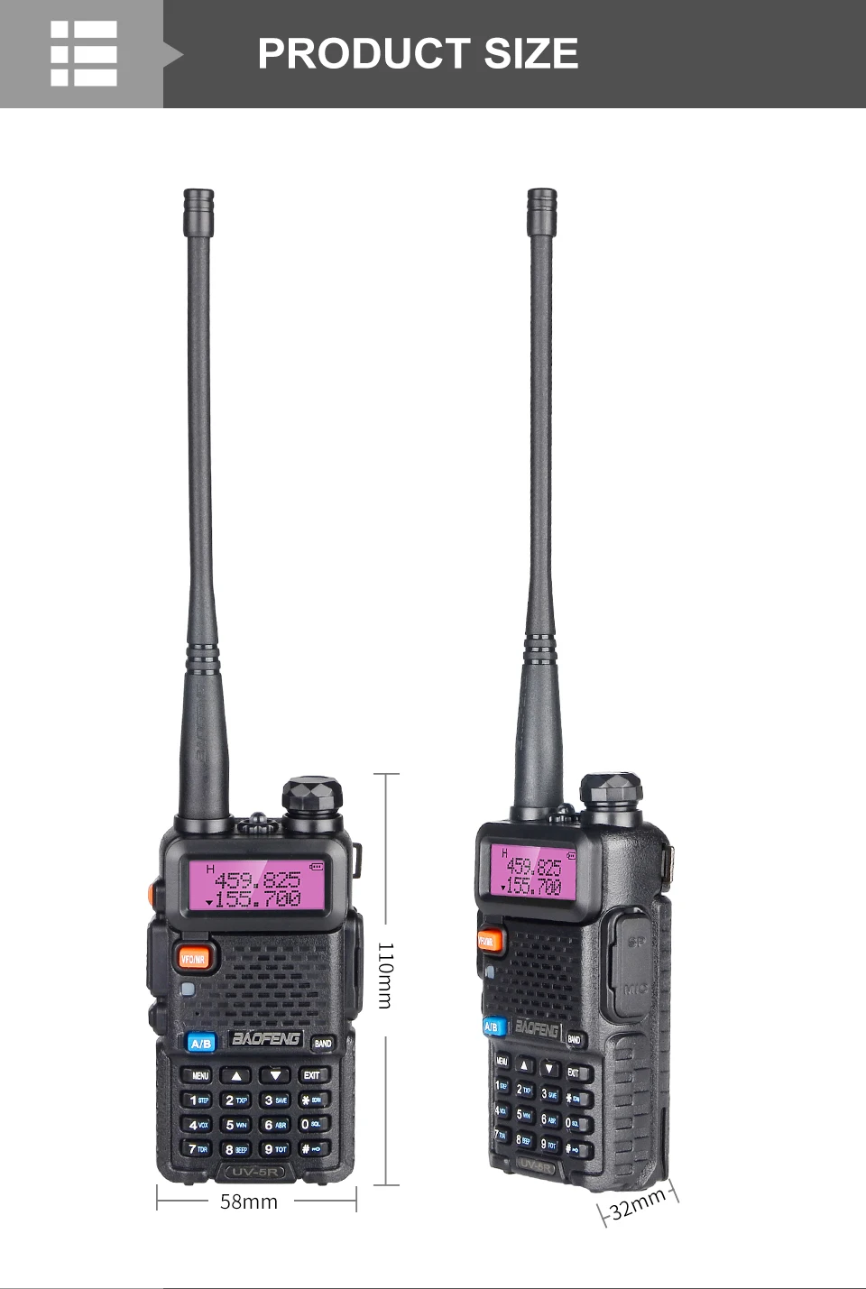 1. Модель: Baofeng UV5R 8W 2. Двухдиапазонный/двойной дисплей/двойной режим ожидания 3. Группа A/B независимая работа (UV UU VV) 4. 128 групп каналов хранения 5. Режим работы быстрого меню 6. Сканирование VFO и каналов памяти 7. Аварийная сигнализация 8. Таймер таймера (TOT) 9. 0 ~ 9 классов VOX 10. PTT & ANI ID 11. Fm-радио и 25 станций хранения 12. Голосовое общение 13. 50 CTCSS/104 DCS 14. Высокая/низкая мощность TX 15. Рабочий канал блокировки (BCLO) 16. Функция DTMF 17. Функция выключения 18. Широкий/узкий диапазон (25 кГц/12,5 кГц) да 19. Функция VOX да 20. Да функция блокировки 21. Функция сканирования да 22. Функция монитора да 23. Таймер таймера (TOT) функция Да 24. ЖК-дисплей да 25. Двойной дисплей да 26. Функция отображения напряжения батареи да 27. Функции отображения и редактирования имени канала Да 28. Индикатор силы сигнала да 29. Функция блокировки клавиатуры да 30. Встроенный светодиодный фонарь да 31. Fm-радио да 32. Функция клона провода да 33. Функция аварийной сигнализации Да 34. Низкий уровень заряда батареи да 35. Функция энергосбережения да 36. Высокая/средняя/низкая мощность TX выбор да 37. 8 Вт/4 Вт/1 Вт 38. Набор Роджера да 39. Голосовые подсказки на китайском и английском языках 40. Программное обеспечение для ПК программируемый да