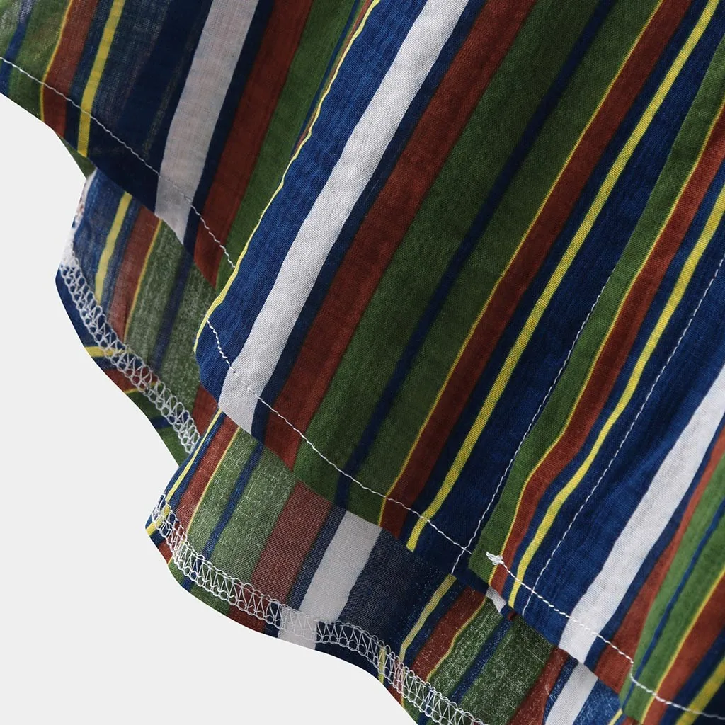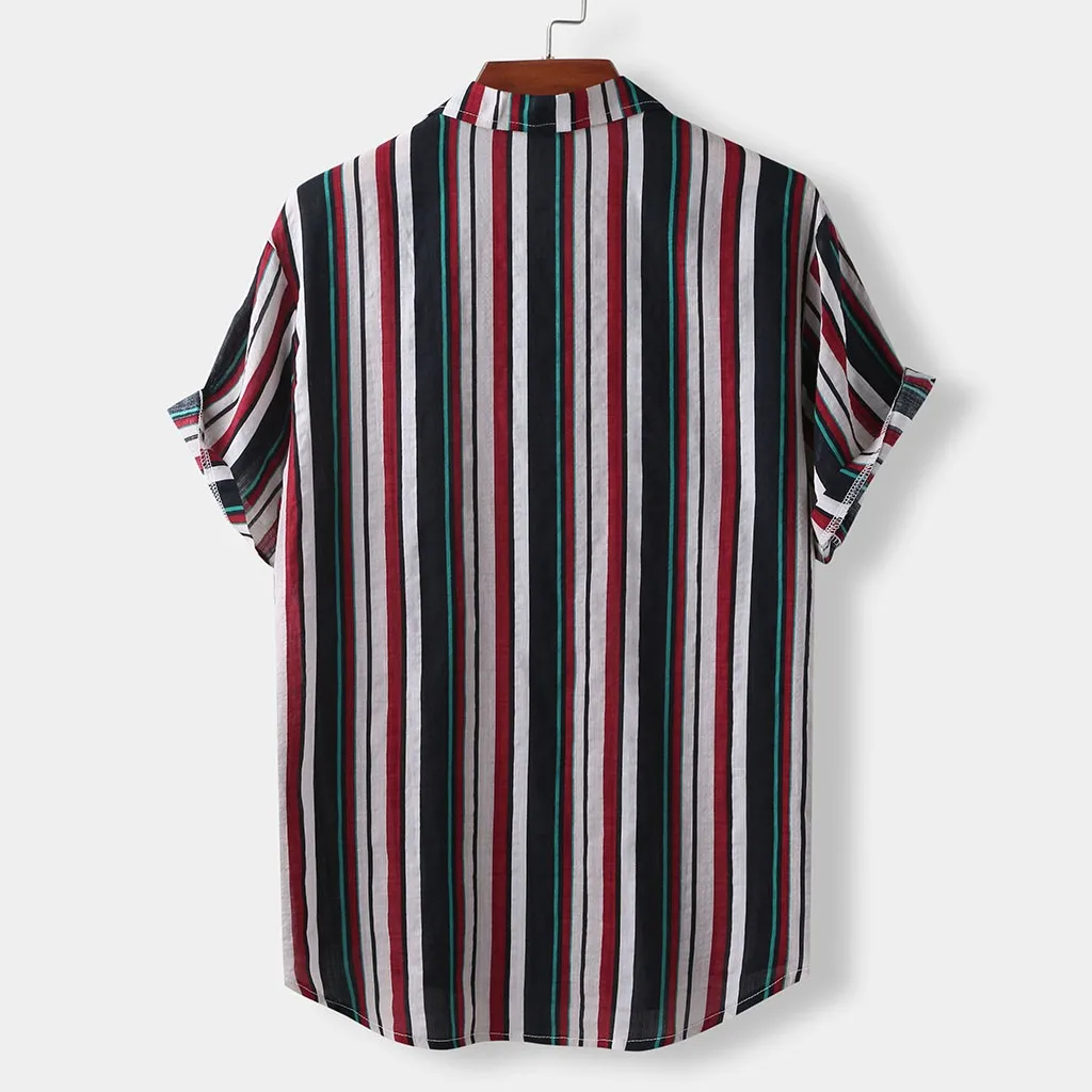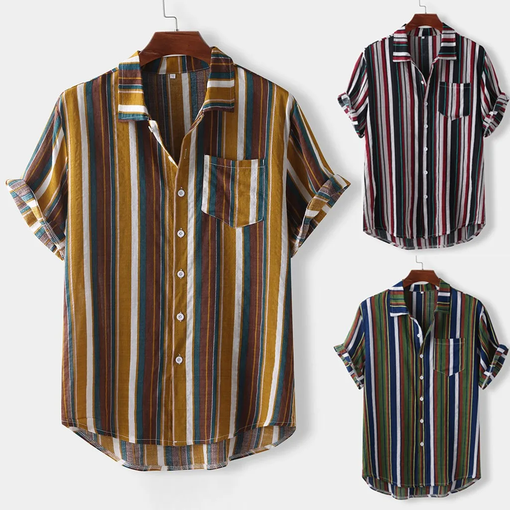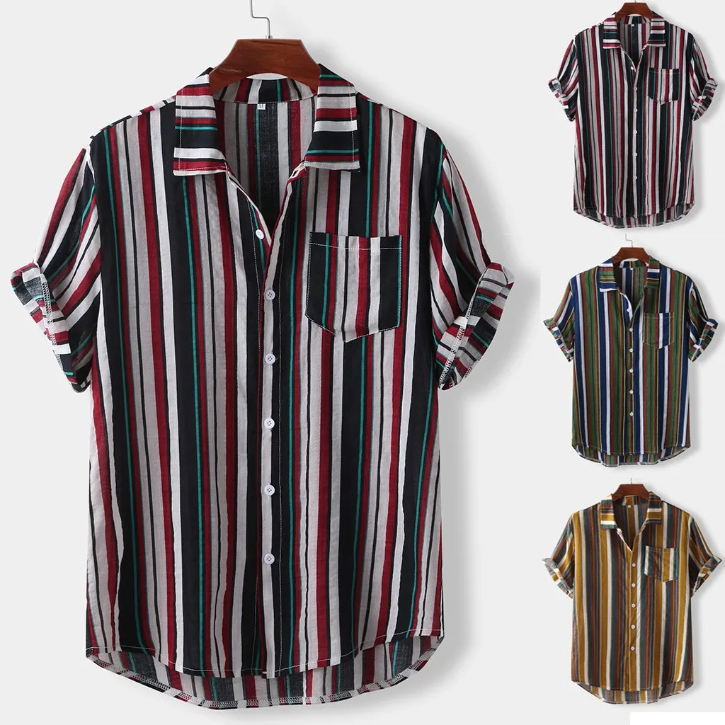 Мужская полосатая летняя свободная Гавайская Повседневная рубашка с коротким рукавом и пуговицами