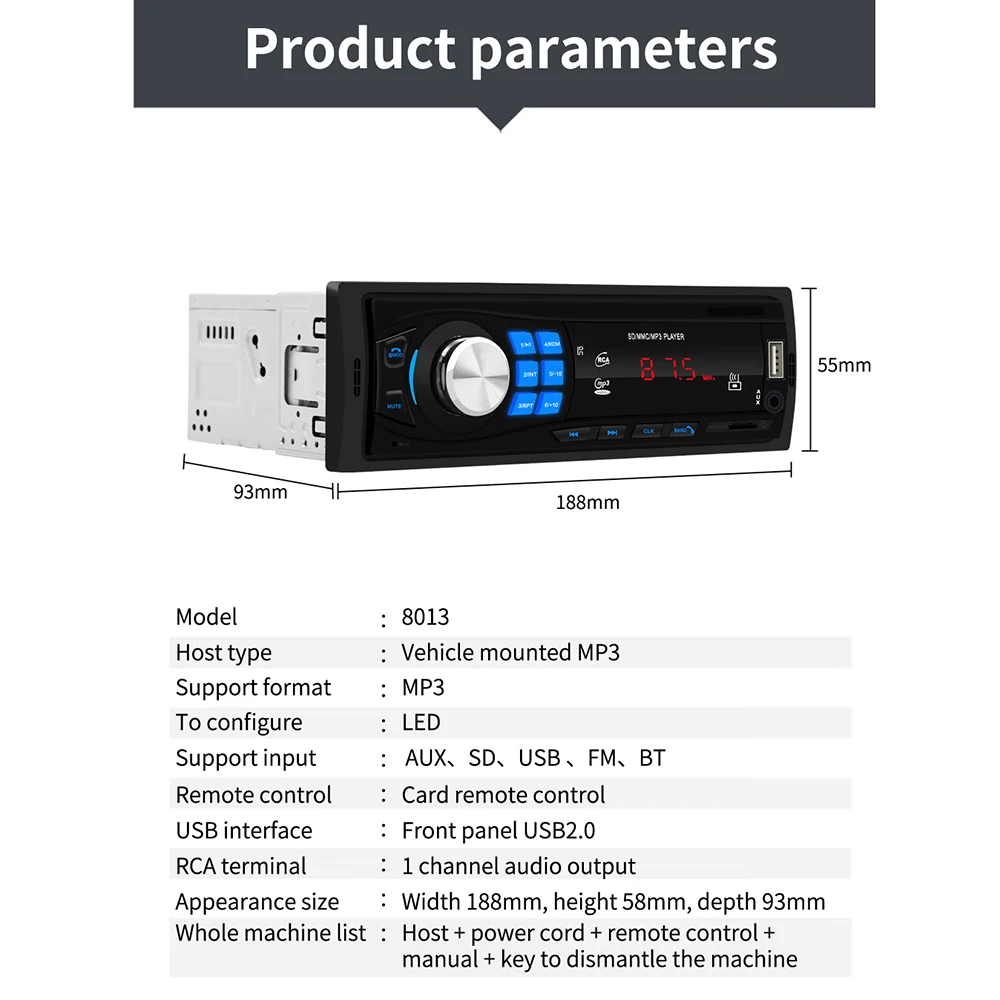 Одноместная автомобильная стереосистема SWM 8013 1 DIN Mp3-плеерПриемник Bluetooth USB AUX FM радио Технические характеристики: Модель: 8013 Напряжение: 12 В Тип: автомобильный стерео MP3-плеер ОС: нет Конфигурация: нет Программное решение: SC3510 Тип экрана светодиодный Размер экрана: нет Разрешение экрана: нет Размер панели: 188*58 мм/7,40*2,28 дюйма Светильник вая панель: светильник Размер цветной коробки: 220*82*181 мм/8,66*3,23*7,13 дюйма Глубина хоста: 100 мм/3,94 дюйма Вес одной машины: 460 г Мобильный телефон интерсоединение: нет GPS-навигация: нет Радиодиапазон: FM Радиомикросхема: Интеграция микросхем Язык: нет Мощность: 45 Вт Рабочая температура: -10 ~ 60 °C Функция обратного изображения: не поддерживается Функция напоминания о торможении: не поддерживается Функция управления рулевым колесом: не поддерживается Модель Bluetooth: Автомобильный BT Чип усилителя: YD1028 Радиочастота: 87,5 ~ 108 МГц Выход видео: Нет Зеркальное отображение экрана: не поддерживается Встроенная офлайн-карта: нет Мобильный телефон интерсоединение: нет Беспроводной Wi-Fi: нет Слот для TF-карты: Да Слот для карты GPS: нет Дистанционное управление: пульт дистанционного управления с помощью карты Дистанционное управление на руле: нет Интерфейс и Версия USB: передняя панель USB2.0 Кнопка сброса: Нет Кнопка: обычная кнопка Rca-клеммное введение: 4-канальный аудио выход Передний аудиовход AUX: Да Мобильный телефон Функция интерсоединения: не поддерживается Функция видеорегистратора: не поддерживается Функция DAB: не поддерживается Функция OBD: не поддерживается Функция ТВ: не поддерживается Модель механизма DVD: нет 4G/3G: не поддерживается Замена логотипа: не поддерживается Поддерживаемые Аудиоформаты: MP3/WMA/WAV/FLAC Поддерживаемые форматы видео: Нет Поддерживаемые форматы изображений: нет Пароль для заводской настройки: нет Примечания: 1. Возможны незначительные отклонения в размере из-за ручного измерения, различных методов измерения и инструментов. 2. Изображение может не отражать реальный цвет изделия из-за разлисветильник, угла и монитора. 1 х хост 1 шнур питания 1 пульт дистанционного управления 1 X приспособление 1 Руководство пользователя
