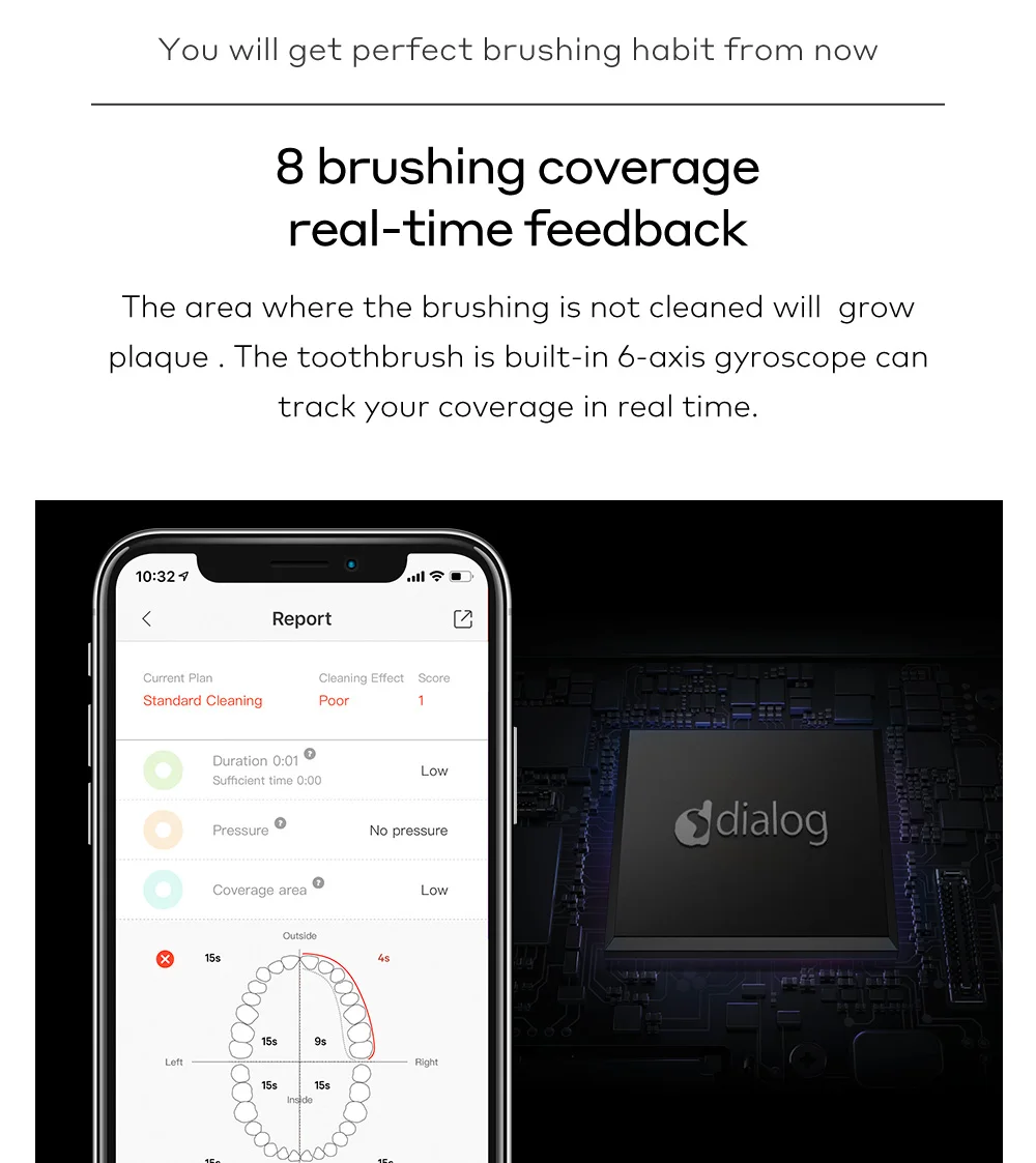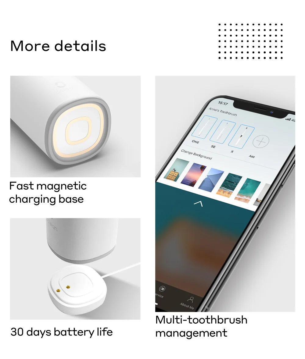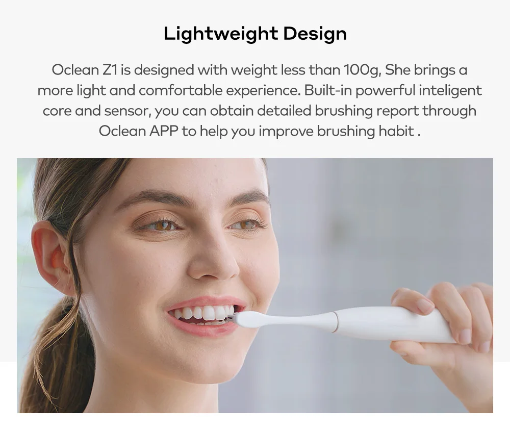 Умная электрическая зубная щетка Oclean Z1-это очень Персонализированная умная зубная щетка. При подключении зубной щетки к приложению Oclean вы можете получить более 20 вариантов чистки и настроить сотни из них. Oclean Z1 поддерживает 32 уровня интенсивности, которые безопасны для чувствительных зубов, свободных зубов, искусственных коронок и зубных протезов. Он может идентифицировать и контролировать 8 областей, чтобы тщательно очистить зубы и помочь улучшить здоровье полости рта.
