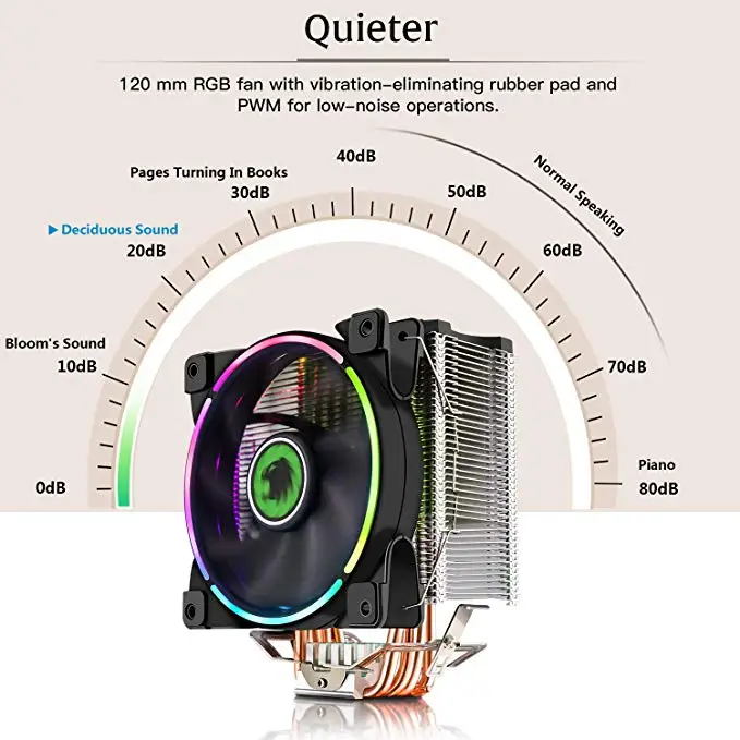 Синхронизированный прибор приемно-цветная (RGB) в Радуга Освещение системная плата 3pin, полностью алюминиевый корпус и вентилятор синхронизируются представить восхитительные световые эффекты одновременно. Легко контролировать Радуга RGB система освещения на совместимая материнская плата (такие как ASUS Aura sync, 5V 3PIN заголовка). Оптимизированный монтажный комплект с усиленным спинка заклепками и зажимами размером легкая установка и увеличения срока службы. Твердые 0,6-mm плавники & 5 теплопроводов холодильник для высоко эффективная передача тепла. 120 мм ARGB вентилятор с вибрацией-устранение резиновая прокладка и PWM с низким уровнем шума. Поддерживает основной Intel и платформы AMD.