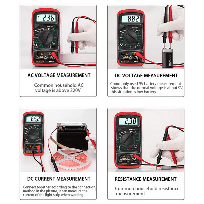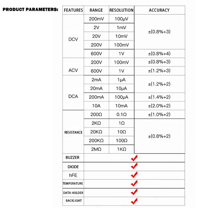** Многофункциональность: Широкий диапазон испытаний для переменного/постоянного напряжения, постоянного тока, сопротивления, зуммера, тестовых диодов, hFE и температуры.
