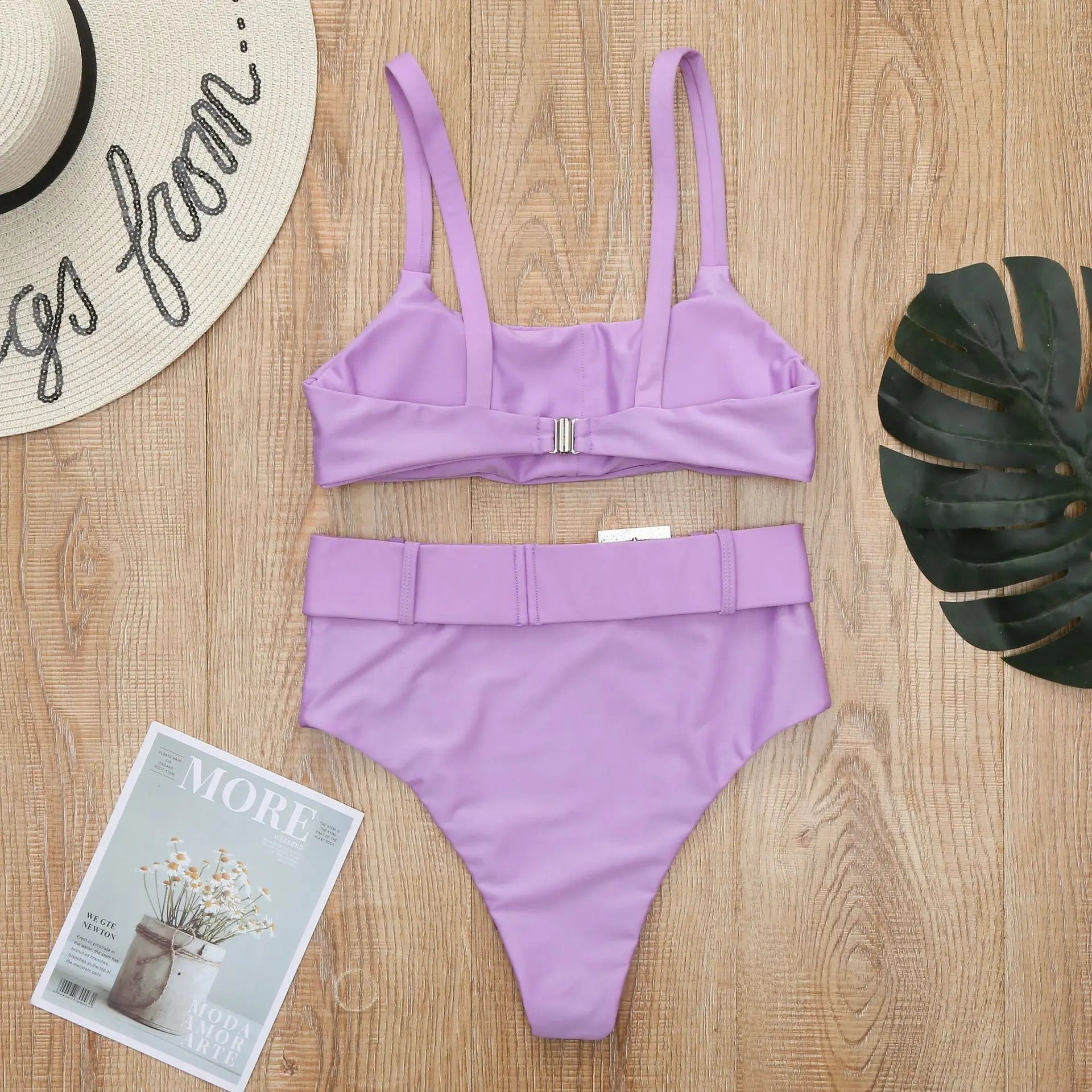 Бикини с высокой талией, однотонный, фиолетовый, высокая нога, Стразы купальник с поясом, пляжный купальный костюм, пуш-ап, мягкий, два предмета, купальник, бикини