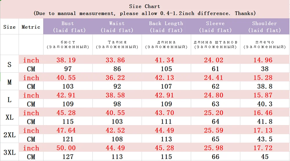 Теплая подсказка: 1. Если вы не уверены в размере, пожалуйста, свяжитесь с нашей службой поддержки клиентов, Или, пожалуйста, оставьте сообщение, спасибо 2. Детальный размер изделия: см/:1 дюйм = 2,54 см, 1 см = 0,39 дюйма 3. Чтобы выбрать более точный размер, вы можете выбрать похожую одежду, чтобы сравнить размер детали, о длине, обхвате груди, талии, плечах. Пожалуйста, ознакомьтесь с информацией о размерах перед выбором размера, спасибо! 4. Если ваши измерения находятся между двумя размерами, советуем выбрать больший размер. 5. При ручном измерении возможна определенная погрешность в 1-3 см 6. Различные компьютерные экраны могут отображать разные цвета, даже если они одного цвета. Поэтому, пожалуйста, учитывайте разумную разницу в цвете, фотографии или наружная съемка и съемка в помещении будут иметь определенную разницу в цвете
