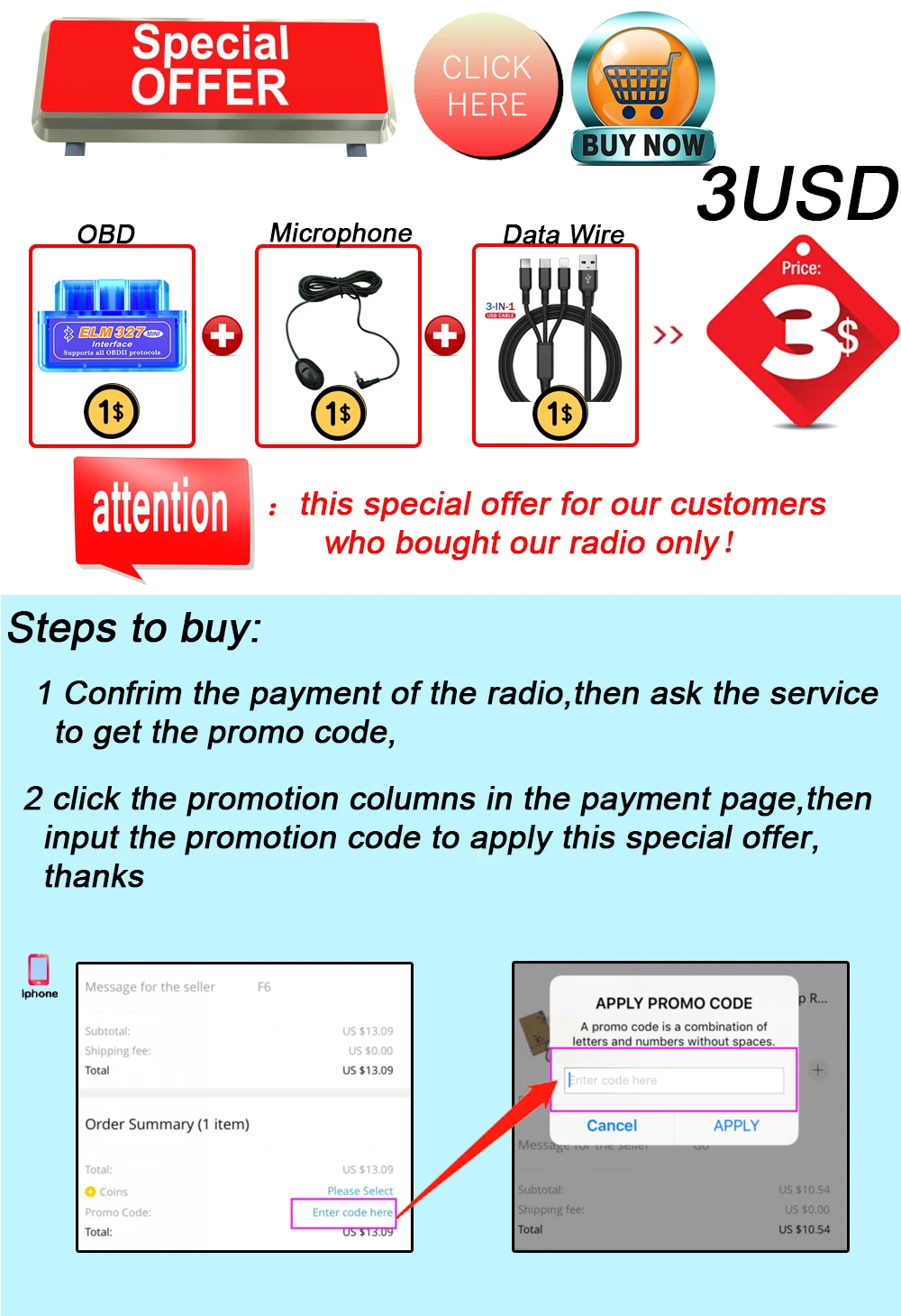 Специальное предложение для клиентов, которые купили наше радио, получат промокод у нас и заплатят дополнительно 3 доллара, можно купить 3 аксессуары, как показано ниже: Шаги для покупки 1 Confrim оплата радио, затем обратитесь к службе Чтобы получить промо-код, 2. Нажмите на рекламные столбцы на странице оплаты, затем Введите промокод для применения этого специального предложения, спасибо
