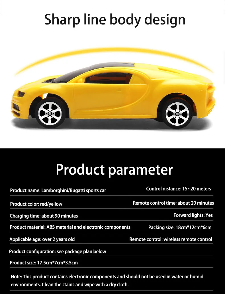 Цвет: как показано Название продукта: спортивный автомобиль Lamborghini/Bugatti Цвет изделия: красный/желтый Время зарядки: около 90 минут Материал изделия: АБС-пластик и электронные компоненты Подходящий возраст: старше 2 лет Конфигурация продукта: см. План поставки ниже Размер изделия: 17,5 см * 7 см * 3,5 см Расстояние управления: 15 ~ 20 метров Время дистанционного управления: около 20 минут Передние фары: Да Пульт дистанционного управления: беспроводной пульт дистанционного управления Размер упаковки: 18 см * 12 см * 6 см Вес: 263 г