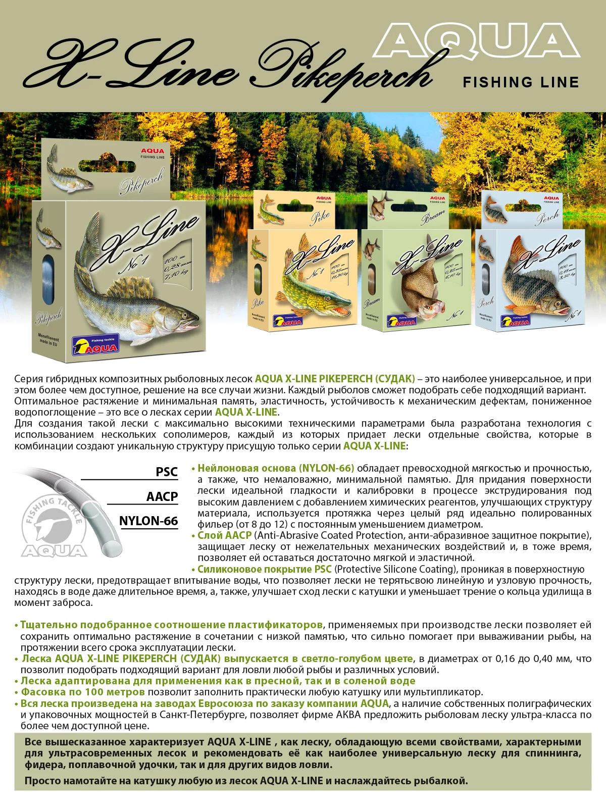 - Леска AQUA X-Line Pikeperch (Судак) выпускается в светло-голубом цвете, в диаметрах от 0,16 до 0,40mm, что позволит подобрать подходящий вариант для ловли любой рыбы и различных условий.