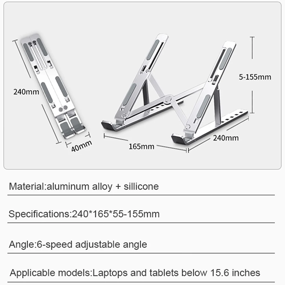 Складная подставка для ноутбука Регулируемая подставка для ноутбука Портативный ноутбук держатель планшета стенд алюминиевого сплава для MacBook Air Pro Спецификация: Материал: алюминиевый сплав + силиконе Технические характеристики: 240*165*55-155 мм Угол: 6-ступенчатая Регулируемая угол Применимые модели: Ноутбуки и планшеты ниже 15,6 дюймов Характеристики: 1> Портативный и складной 2> 6-ступенчатая регулировка высоты 3> Полое нижнее рассеивание тепла 4> Нескользящее Силиконовое дно Пакет: 1 * подставка для ноутбука 1 * сумка для хранения