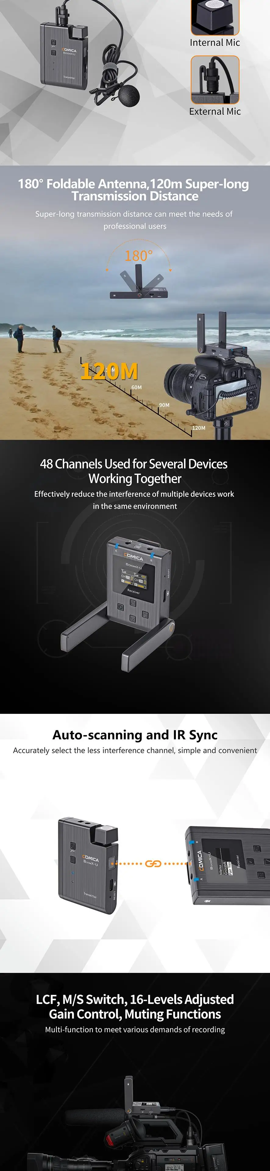 Основные характеристики . Мини и портативный, уровень трансляции . Двойные передатчики, срабатывающие одним приемником . Мульти-приемник мониторинга и съемки . Внутренний и внешний микрофон два входных режима . Рабочее расстояние до 120 м . 48 каналов, используемых для нескольких устройств, работающих вместе . Автоматическое сканирование для быстрого выбора канала . Переключатель LCF, M/S, 16 уровней регулировки усиления, функции слива . Визуальная мощность и аудио динамический монитор в реальном времени . Специальный анти-свободный дизайн для внешнего микрофона Lavalier . Цветной TFT дисплей, высокое разрешение . Подставка для экрана . Разработан с многофункциональным зажимом для ремня и компактным Уведомление . Пожалуйста, убедитесь, что ИК-датчик тесно выровнен при сопряжении . Не блокируйте положение антенны, чтобы избежать любого плохого генерируемого сигнала . Пожалуйста, обратите внимание, что он не может реализовать функцию стерео, когда в режиме one-trigger-one . Рекомендуется держать расстояние более одного метра между двумя передатчиками при использовании функции ИК-синхронизации, или это легко вызвать несоответствие . Этот продукт относится к высокоточным инструментам, Пожалуйста, избегайте падения, столкновения или удара . Не используйте это оборудование вблизи источника тепла или источника помех, таких как радиатор, духовка, Wi-Fi AP, домофон или рядом с другими беспроводными устройствами . Если расстояние захвата близко или при использовании на открытом воздухе, пожалуйста, наденьте на ветер mu, чтобы предотвратить взрыв звука или уменьшить шум ветра . Не используйте оборудование под дождем или во влажной среде, чтобы избежать опасности короткого замыкания . Пожалуйста, храните продукт в сухом месте
