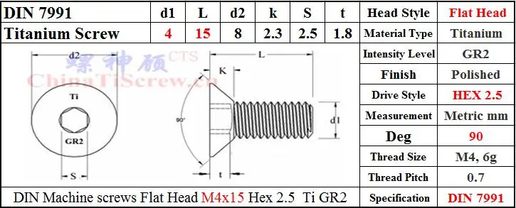 У нас есть DIN 7991 Титан винты M4x6 M4x8 M4x10 M4x12 M4x14 M4x15 M4x16 M4x18 M4x20 M4x22 M4x25 M4x30 в наличии, Hed с шестигранной головкой 2,0 драйвер Ti GR2 полированный. GR2 без магнитной