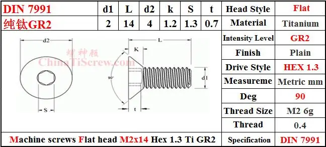 DIN 7991 титановый винт M2x14 плоская головка Шестигранная 1,3 драйвер Ti GR2 без магнита