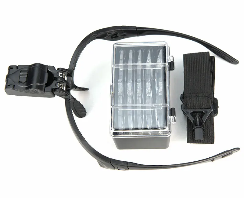 Особенности: • Кронштейн для очков и оголовье являются взаимозаменяемыми. • Часть освещения можно вынуть отдельно для одноразового использования. • Доступны пять видов линз с различными увеличениями. • Отрегулируйте угол объектива, чтобы увеличить пружинное фиксирующее устройство. • Угол освещения регулируется.