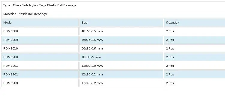 Материал POM и PA с хорошей механической прочностью и износостойкостью. Они подходят для производства прецизионных пластиковых подшипников. Рабочая температура составляет от-60 ℃-100 ℃, с высокой прочностью и гладкой поверхностью, в основном не появляются напряжения, хорошие самосмазывающиеся свойства и низкий коэффициент трения. На основе сохранения традиционных преимуществ пластиковых подшипников, они могут быть применены к точности и более высокой скорости работы. Пластиковые подшипники POM наиболее широко используются для всех палстических подшипников. Внутри и снаружи шаровой материал POM или PA, клетка из армированного стекловолокном нейлона 66(GRPA66-25), шаровой стеклянный шар, шарики из нержавеющей стали или керамические шарики. Такой подшипник физиологически инертный и подходит для контакта с пищей, щелочной окружающей среды, хорошая производительность, но не подходит для работы при коррозии thr кислоты и окружающей среды сильных окислителей.