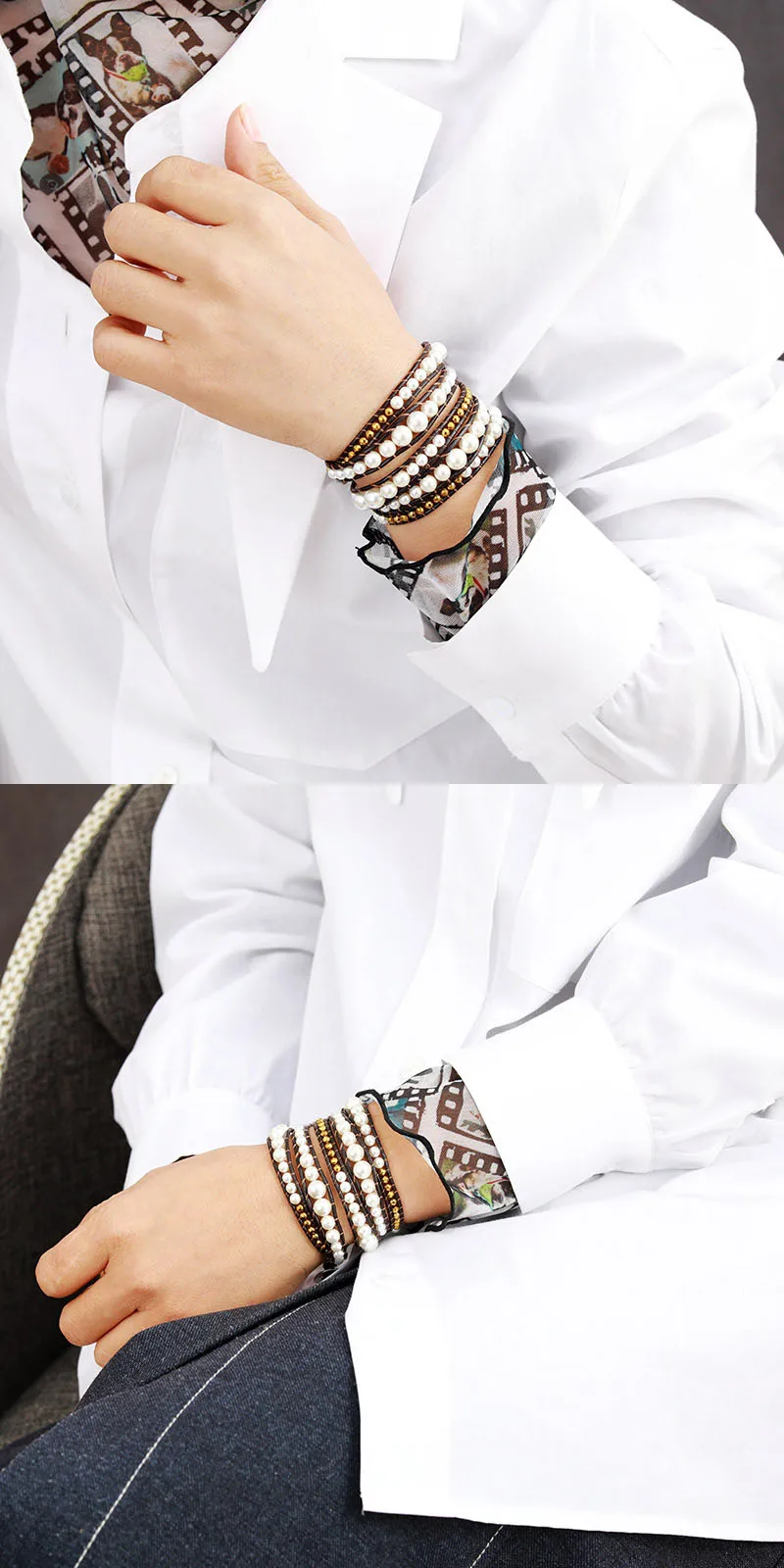 Элегантный жемчужный кожаный браслет 5 рядов
