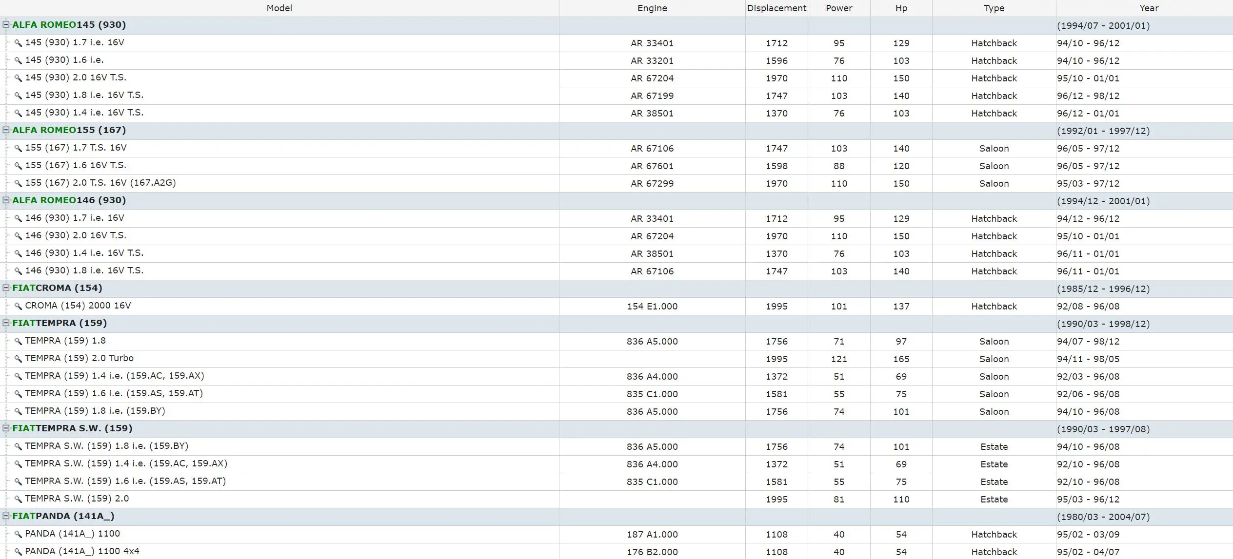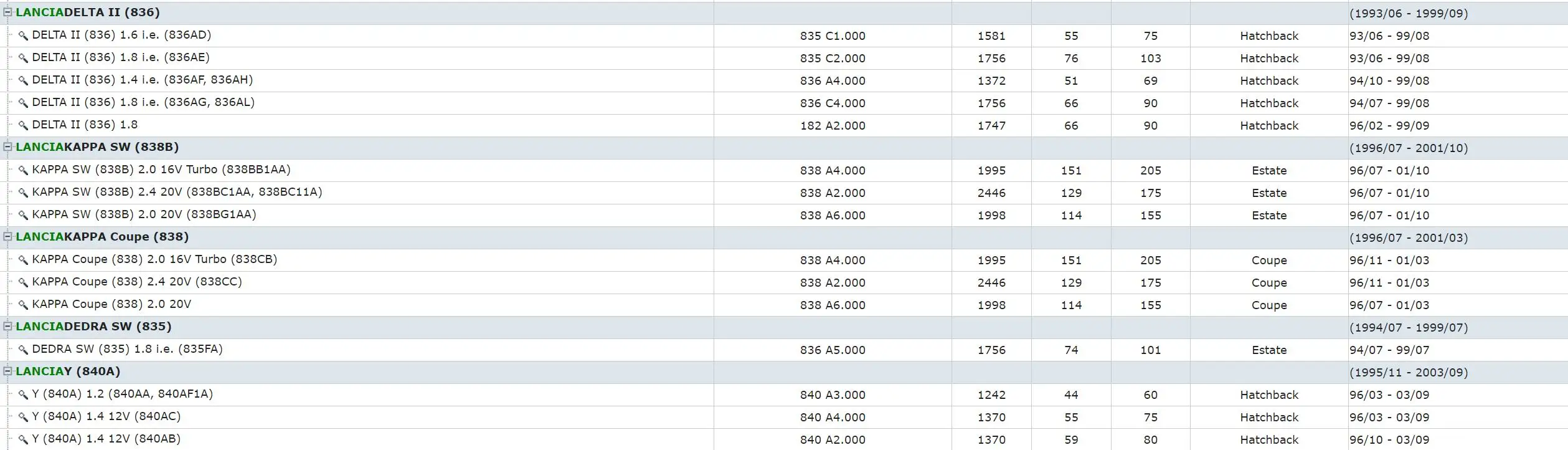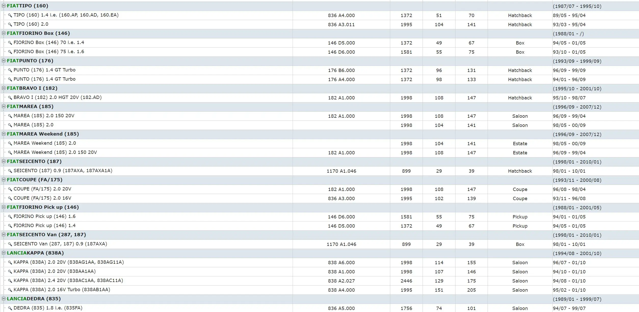 1. Лямбда-датчик, кислородный датчик, датчик O2 2. Применение: Модель двигателя объёмная мощность Hp Тип год ALFA ROMEO145 (930) (1994/07-2001/01) 145 (930) 1,7 i.e. 16 V AR 33401 1712 95 129 хэтчбек 94/10-96/12 145 (930) 1,6 т. Е. AR 33201 1596 76 103 хэтчбек 94/10-96/12 145 (930) 2,0 16 V T. AR 67204 1970 110 150 хэтчбек 95/10-01/01 145 (930) 1,8 i.e. 16 V T. AR 67199 1747 103 140 хэтчбек 96/12-98/12 145 (930) 1,4 i.e. 16 V T. AR 38501 1370 76 103 хэтчбек 96/12-01/01 ALFA ROMEO155 (167) (1992/01-1997/12) 155 (167) 1,7 Т. С. 16 V AR 67106 1747 103 140 седан 96/05-97/12 155 (167) 1,6 16 V T. AR 67601 1598 88 120 седан 96/05-97/12 155 (167) 2,0 Т. С. 16 V (167. A2G) AR 67299 1970 110 150 седан 95/03-97/12 ALFA ROMEO146 (930) (1994/12-2001/01) 146 (930) 1,7 i.e. 16 V AR 33401 1712 95 129 хэтчбек 94/12-96/12 146 (930) 2,0 16 V T. AR 67204 1970 110 150 хэтчбек 95/10-01/01 146 (930) 1,4 i.e. 16 V T. AR 38501 1370 76 103 хэтчбек 96/11-01/01 146 (930) 1,8 i.e. 16 V T. AR 67106 1747 103 140 хэтчбек 96/11-01/01 Фиаткрома (154) (1985/12-1996/12) CROMA (154) 2000 16 V 154 E1.000 1995 101 137 хэтчбек 92/08-96/08 Fiatterpra (159) (1990/03-1998/12) Темпра (159) 1,8 836 A5.000 1756 71 97 седан 94/07-98/12 Темпра (159) 2,0 Turbo 1995 121 165 седан 94/11-98/05 Темпра (159) 1,4 i.e. (159.AC, 159.AX) 836 A4.000 1372 51 69 седан 92/03-96/08 Темпра (159) 1,6 i.e. (159.AS, 159.AT) 835 C1.000 1581 55 75 седан 92/06-96/08 Темпра (159) 1,8 i.e. (159.BY) 836 A5.000 1756 74 101 седан 94/10-96/08 FIATTEMPRA S.W. (159) (1990/03-1997/08) Темпра S.W. (159) 1,8 i.e. (159.BY) 836 A5.000 1756 74 101 универсал 94/10-96/08 Темпра S.W. (159) 1,4 i.e. (159.AC, 159.AX) 836 A4.000 1372 51 69 универсал 92/10-96/08 Темпра S.W. (159) 1,6 i.e. (159.AS, 159.AT) 835 C1.000 1581 55 75 универсал 92/10-96/08 Темпра S.W. (159) 2,0 1995 81 110 универсал 95/03-96/12 FIATPANDA (141A _) (1980/03-2004/07) Панда (141A _) 1100 187 A1.000 1108 40 54 хэтчбек 95/02-03/09 Панда (141A _) 1100 4x4 176 B2.000 1108 40 54 хэтчбек 95/02-04/07 Фиаттипо (160) (1987/07-1995/10) TIPO (160) 1,4 i.e. (160.AP, 160.AD, 160.EA) 836 A4.000 1372 51 70 хэтчбек 89/05-95/04 TIPO (160) 2,0 836 A3.011 1995 104 141 хэтчбек 93/03-95/04 FIATFIORINO коробка (146) (1988/01-/) FIORINO коробка (146) 70 i.e. 1,4 146 D5.000 1372 49 67 коробка 94/05-01/05 FIORINO коробка (146) 75 i.e. 1,6 146 D6.000 1581 55 75 коробка 93/10-01/05 FIATPUNTO (176) (1993/09-1999/09) PUNTO (176) 1,4 GT Turbo 176 B6.000 1372 96 131 хэтчбек 96/09-99/09 PUNTO (176) 1,4 GT Turbo 176 A4.000 1372 98 133 хэтчбек 94/01-96/09 FIATBRAVO I (182) (1995/10-2001/10) BRAVO I (182) 2,0 HGT 20 V (182.AD) 182 A1.000 1998 108 147 хэтчбек 95/10-98/07 FIATMAREA (185) (1996/09-2007/12) MAREA (185) 2,0 150 20 V 182 A1.000 1998 108 147 седан 96/09-99/04 MAREA (185) 2,0 1998 104 141 седан 98/05-00/09 FIATMAREA Weekend (185) (1996/09-2007/12) MAREA (185) 2,0 1998 104 141 универсал 98/05-00/09 MAREA (185) 2,0 150 20 V 182 A1.000 1998 108 147 универсал 96/09-99/04 FIATSEICENTO (187) (1998/01-2010/01) SEICENTO (187) 0,9 (187AXA, 187AXA1A) 1170 A1.046 899 29 39 хэтчбек 98/01-10/01 FIATCOUPE (FA/175) (1993/11-2000/08) COUPE (FA/175) 2,0 20 V 182 A1.000 1998 108 147 купе 96/08-98/04 COUPE (FA/175) 2,0 16 V 836 A3.000 1995 102 139 купе 93/11-96/08 FIATFIORINO pick up (146) (1988/01-2001/05) FIORINO Палочки (146) 1,6 146 D6.000 1581 55 75 Палочки до 94/01-01/05 FIORINO Палочки (146) 1,4 146 D5.000 1372 49 67 Палочки до 94/05-01/05 FIATSEICENTO Van (287, 187) (1998/01-2010/01) SEICENTO фургон (287, 187) 0,9 (187AXA) 1170 A1.046 899 29 39 коробка 98/01-10/01 LANCIAKAPPA (838A) (1994/08-2001/10) Каппа (838A) 2,0 20 V (838AG1AA, 838AG11A) 838 A6.000 1998 114 155 седан 96/07-01/10 Каппа (838A) 2,0 20 V (838AA1AA) 838 A1.000 1998 107 146 седан 94/10-01/10 Каппа (838A) 2,4 20 V (838AC1AA, 838AC11A) 838 A2.027 2446 129 175 седан 94/08-01/10 Каппа (838A) 2,0 16 V Turbo (838AB1AA) 838 A4.000 1995 151 205 седан 95/02-01/10 LANCIADEDRA (835) (1989/01-1999/07) DEDRA (835) 1,8 i.e. (835FA) 836 A5.000 1756 74 101 седан 94/07-99/07 LANCIADELTA II (836) (1993/06-1999/09) Delta II (836) 1,6 i.e. (836AD) 835 C1.000 1581 55 75 Хэтчбек 93/06-99/08 Delta II (836) 1,8 i.e. (836AE) 835 C2.000 1756 76 103 хэтчбек 93/06-99/08 Delta II (836) 1,4 i.e. (836AF, 836AH) 836 A4.000 1372 51 69 хэтчбек 94/10-99/08 Delta II (836) 1,8 i.e. (836AG, 836AL) 836 C4.000 1756 66 90 Хэтчбек 94/07-99/08 Delta II (836) 1,8 182 A2.000 1747 66 90 Хэтчбек 96/02-99/09 LANCIAKAPPA SW (838B) (1996/07-2001/10) Каппа SW (838B) 2,0 16 V Turbo (838BB1AA) 838 A4.000 1995 151 205 универсал 96/07-01/10 Каппа SW (838B) 2,4 20 V (838BC1AA, 838BC11A) 838 A2.000 2446 129 175 универсал 96/07-01/10 Каппа SW (838B) 2,0 20 V (838BG1AA) 838 A6.000 1998 114 155 универсал 96/07-01/10 LANCIAKAPPA Coupe (838) (1996/07-2001/03) Каппа купе (838) 2,0 16 V Turbo (838CB) 838 A4.000 1995 151 205 купе 96/11-01/03 Каппа купе (838) 2,4 20 V (838CC) 838 A2.000 2446 129 175 купе 96/11-01/03 Каппа купе (838) 2,0 20 V 838 A6.000 1998 114 155 купе 96/07-01/03 LANCIADEDRA SW (835) (1994/07-1999/07) DEDRA SW (835) 1,8 i.e. (835FA) 836 A5.000 1756 74 101 универсал 94/07-99/07 LANCIAY (840A) (1995/11-2003/09) Y (840A) 1,2 (840AA, 840AF1A) 840 A3.000 1242 44 60 хэтчбек 96/03-03/09 Y (840A) 1,4 12 V (840AC) 840 A4.000 1370 55 75 Хэтчбек 96/03-03/09 Y (840A) 1,4 12 