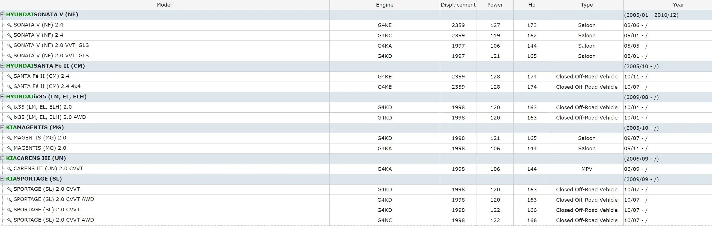 Sondaisonata V (NF) (2005/01 - 2010/12) SONATA V (NF) 2,4 G4KE 2359 127 173 Saloon 08/06 - / SONATA V (NF) 2,4 G4KC 2359 119 162 Saloon 05/01 - / SONATA V (NF) 2,0 VVTi GLS G4KA 1997 106 144 Saloon 05/05 - / SONATA V (NF) 2,0 VVTi GLS G4KD 1997 121 165 салон 08/01 - / HYUNDAISANTA Fé II (см) (2005/10 - /) Санта-Фэ II (см) 2,4 G4KE 2359 128 174 закрытое внедорожное транспортное средство 10/11 - / SANTA Fé II (см) 2,4 4x4 G4KE 2359 128 174 закрытое внедорожное транспортное средство 10/07 - / HYUNDAIix35 (LM, EL, ELH) (2009/08 - /) ix35 (LM, EL, ELH) 2,0 G4KD 1998 120 163 закрытое внедорожное транспортное средство 10/01 - / ix35 (LM, EL, ELH) 2,0 4WD G4KD 1998 120 163 закрытое внедорожное транспортное средство 10/01 - / KIAMAGENTIS (мг) (2005/10 - /) MAGENTIS (MG) 2,0 G4KD 1998 121 165 салон 09/07 - / MAGENTIS (MG) 2,0 G4KA 1998 106 144 салон 05/11 - / KIACARENS III (UN) (2006/09 - /) CARENS III (UN) 2,0 CVVT G4KA 1998 106 144 MPV 06/09 - / KIASPORTAGE (SL) (2009/09 - /) SPORTAGE (SL) 2,0 CVVT G4KD 1998 120 163 закрытое внедорожное транспортное средство 10/07 - / SPORTAGE (SL) 2,0 CVVT AWD G4KD 1998 120 163 закрытое внедорожное транспортное средство 10/07 - / SPORTAGE (SL) 2,0 CVVT G4KD 1998 122 166 закрытое внедорожное транспортное средство 10/07 - / SPORTAGE (SL) 2,0 CVVT AWD G4NC 1998 122 166 закрытое внедорожное транспортное средство 10/07 - /
